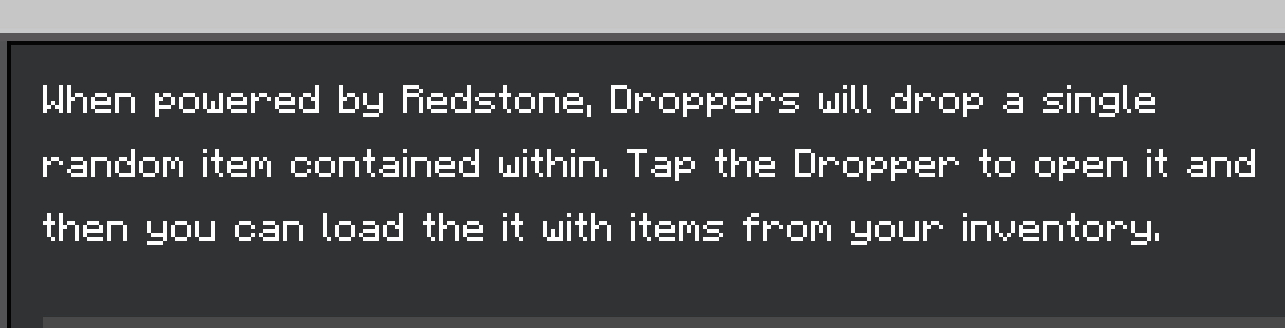 Dropper Encyclopedia for Touch Controls has a Typo. Within, it says "Tap the Dropper to open it and then you can load the it with items from your inventory."