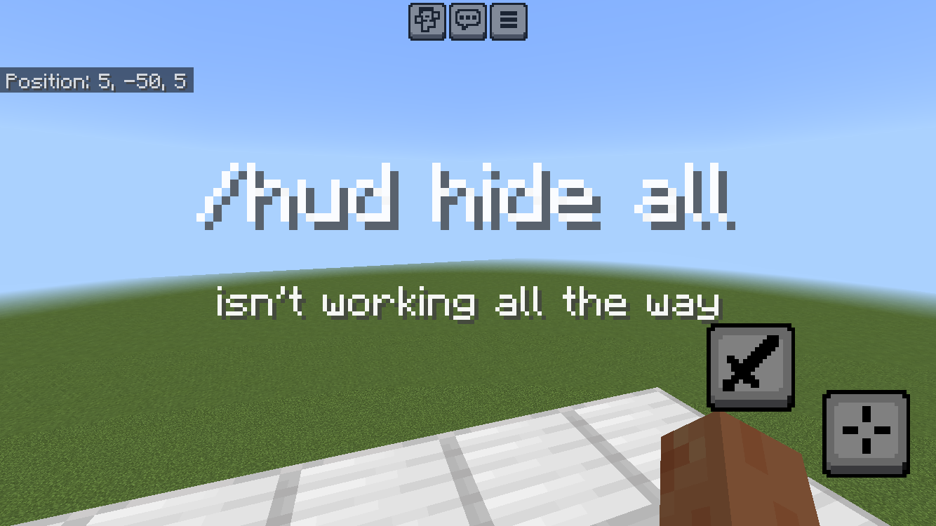 I was testing things on a new Flatworld with experiments on and found that the /hud command has some errors. I used an alt account on my phone to join the same world and used "/hud @s hide all" and it hide all hud items except the attack and place/use buttons. I was using the "Joystick & aim crosshair" controller mode, so it probably didn't realize there were more buttons to hide.