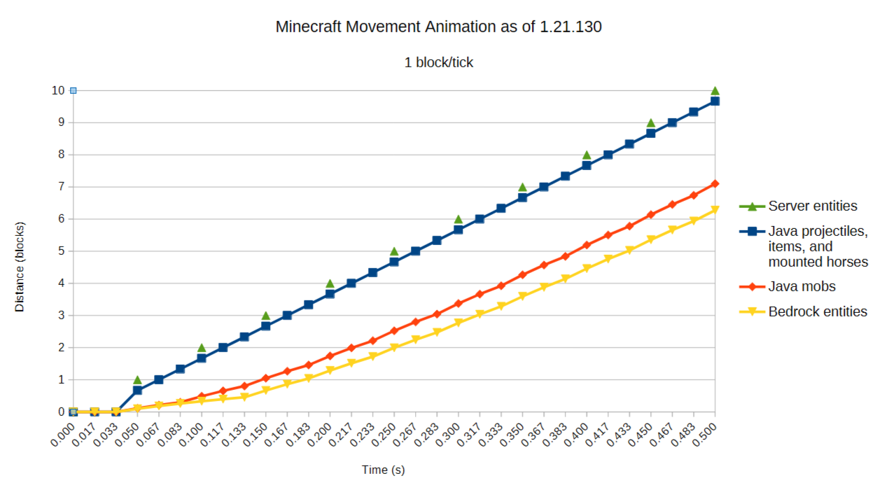 The chart below illustrates the difference in visual vs. server-side position over the first 0.5 seconds of an entity moving 1 block/tick (the speed of a deflected projectile in Bedrock Edition).