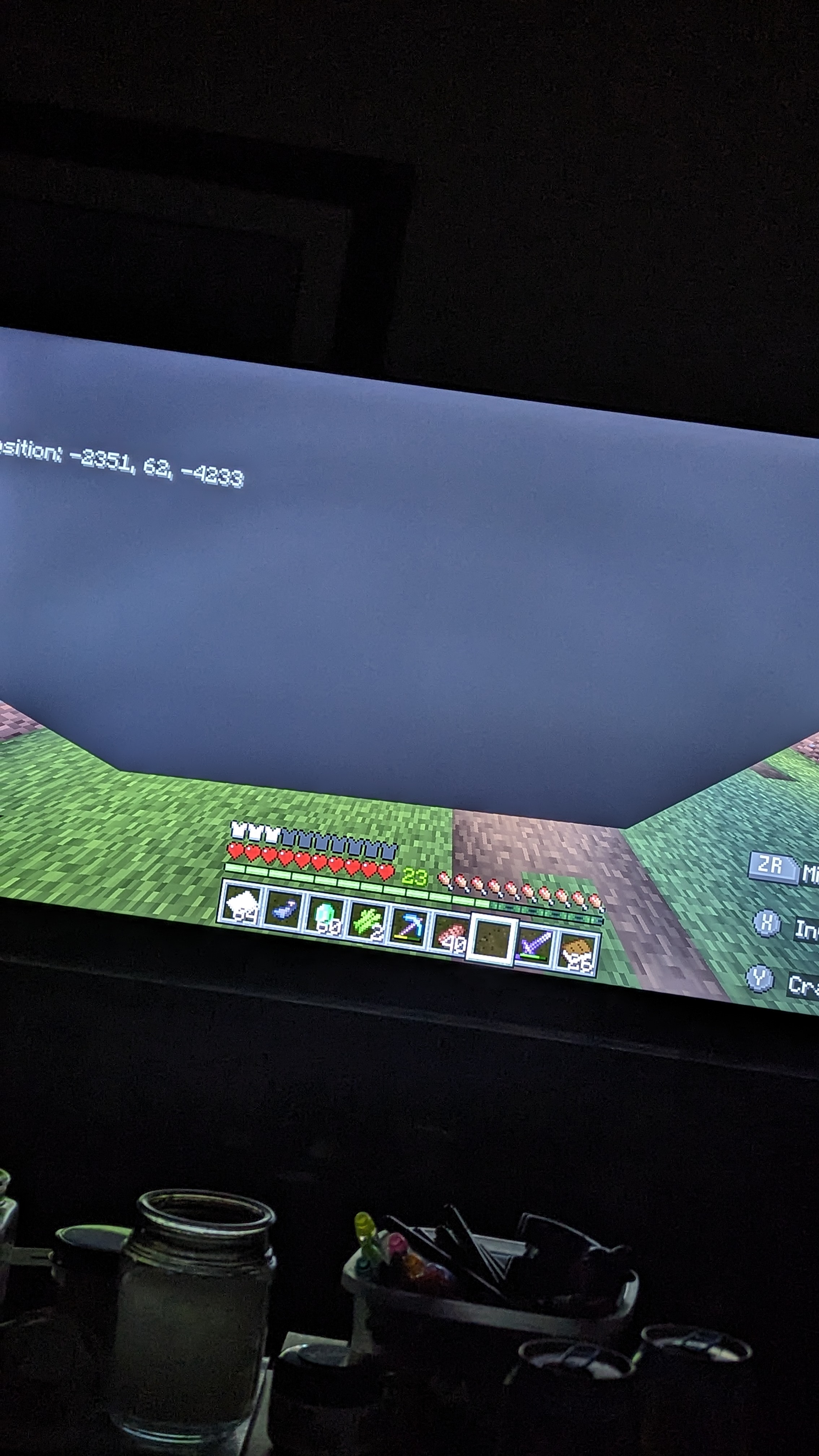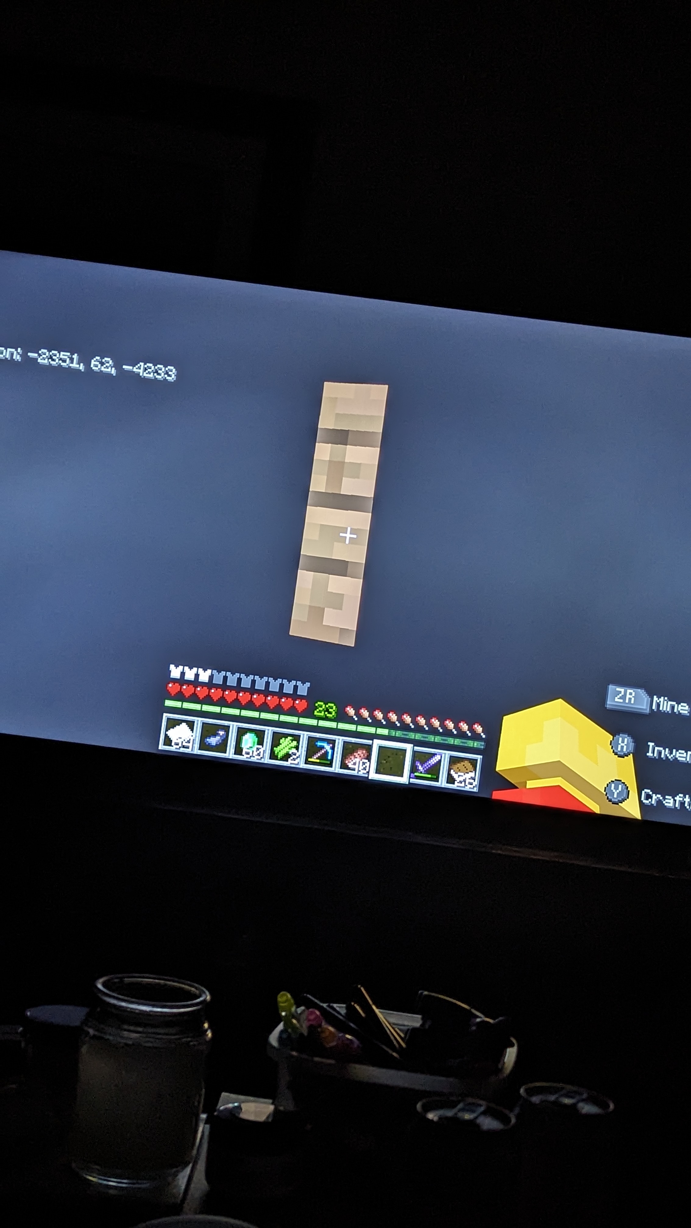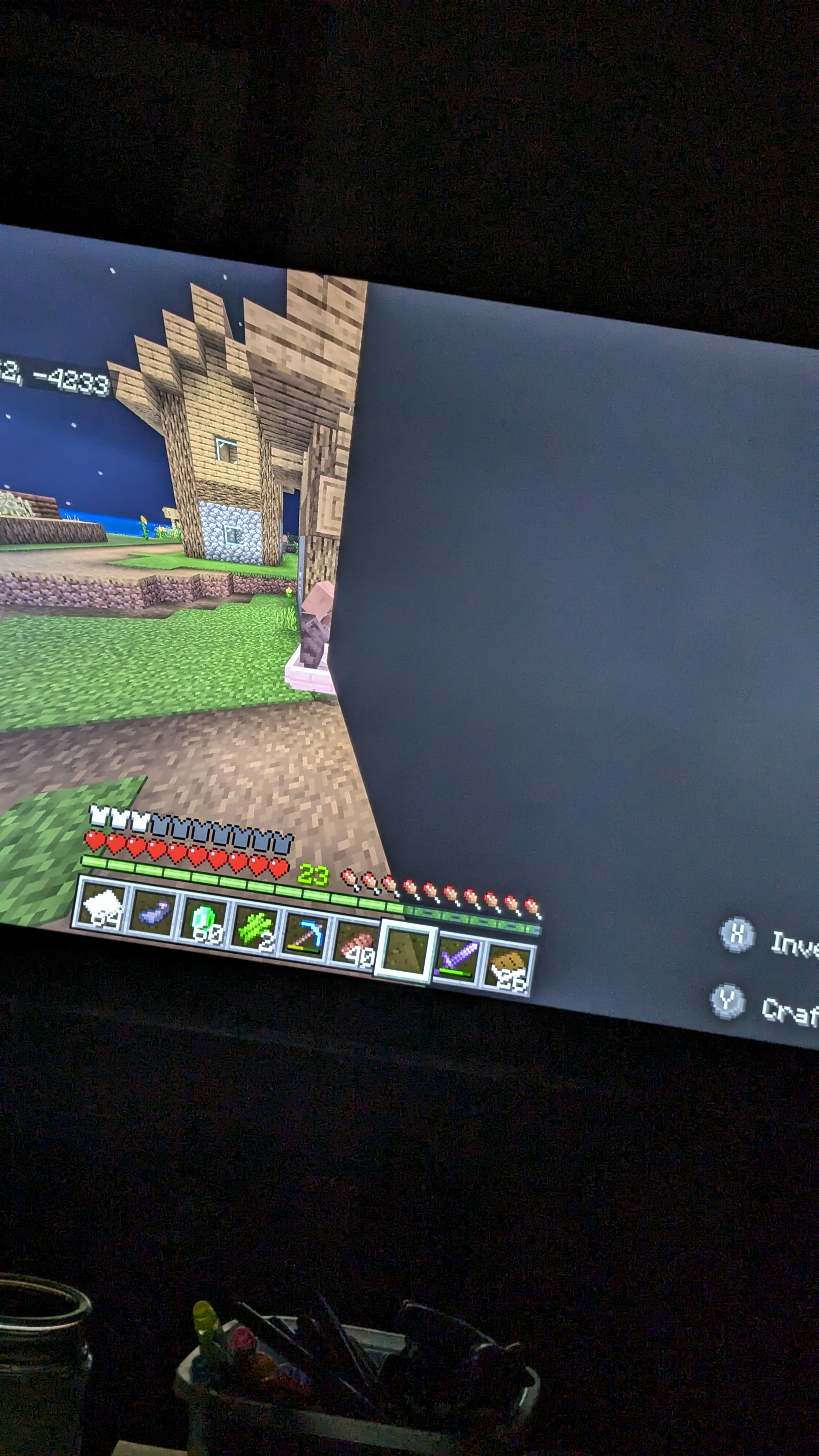 I'm in a village getting villagers. When I put a villager in a boat with me and drive into a single fence column, there is a very big black box in my vision that stays no matter what camera perspective. It does not provide x-ray, Just rendering glitch I think. Attached images are the three different camera perspectives