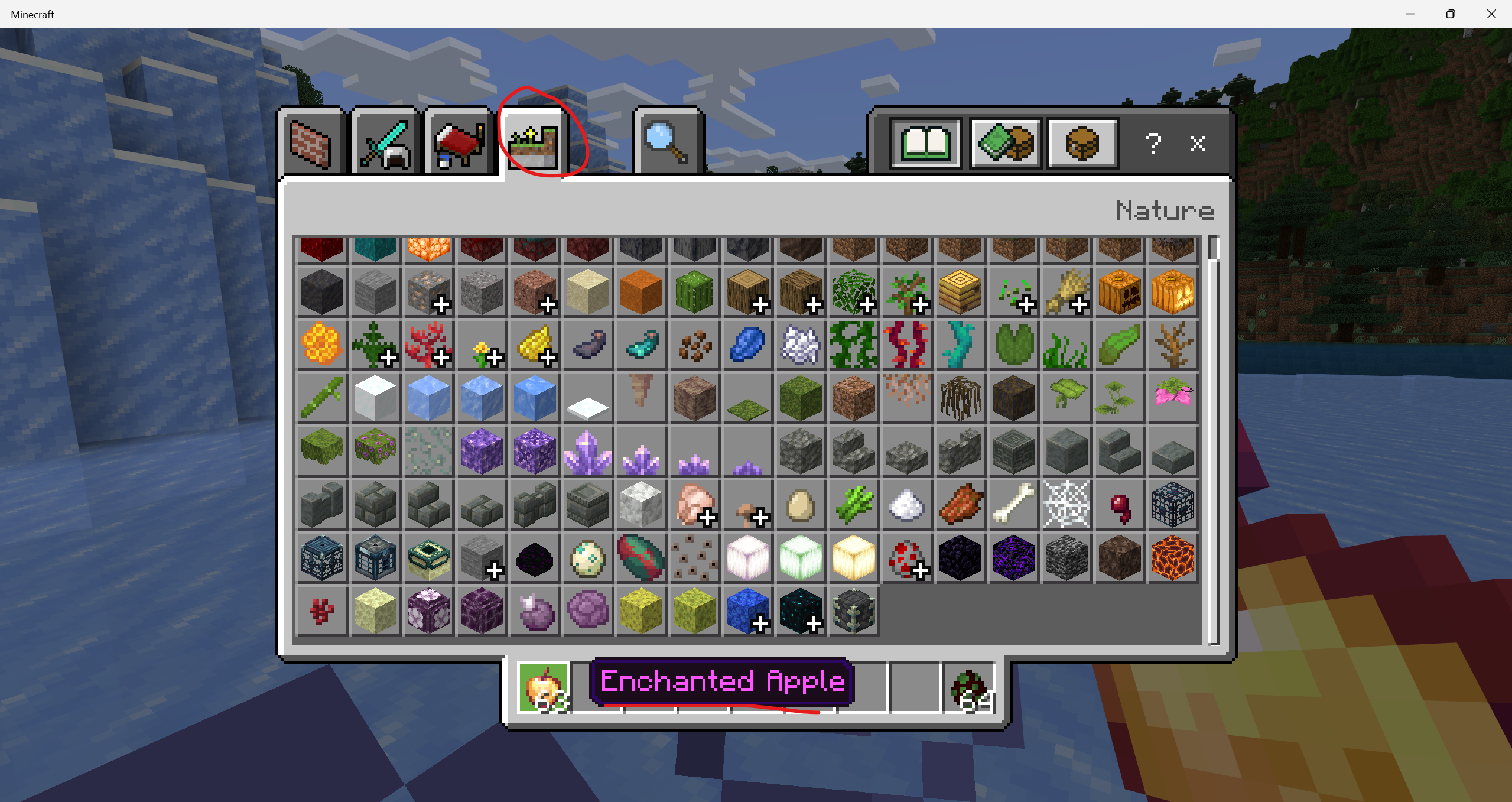 When hovering an item with the "search" tab of the inventory active, the item displays its category ("Nature", etc) inside the inventory, for the player know where to find it in creative.