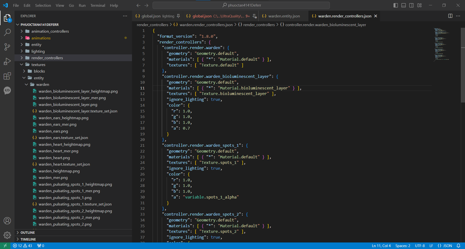 I tried using different packages on mcpedl.com, but the issue persisted. That is, until I looked at warden.render_controllers.json. Bioluminescent_layer has an impact on texture rendering, I discovered.