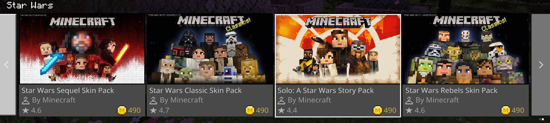 To reproduce this: Simply go to the marketplace and click the "Pop culture" section. If you scroll down, you'll see that under Star Wars section, only 6 of the total 7 Star Wars packs can be found. The one missing (prequel trilogy skin pack) can be found by searching for Star Wars in the search tab.