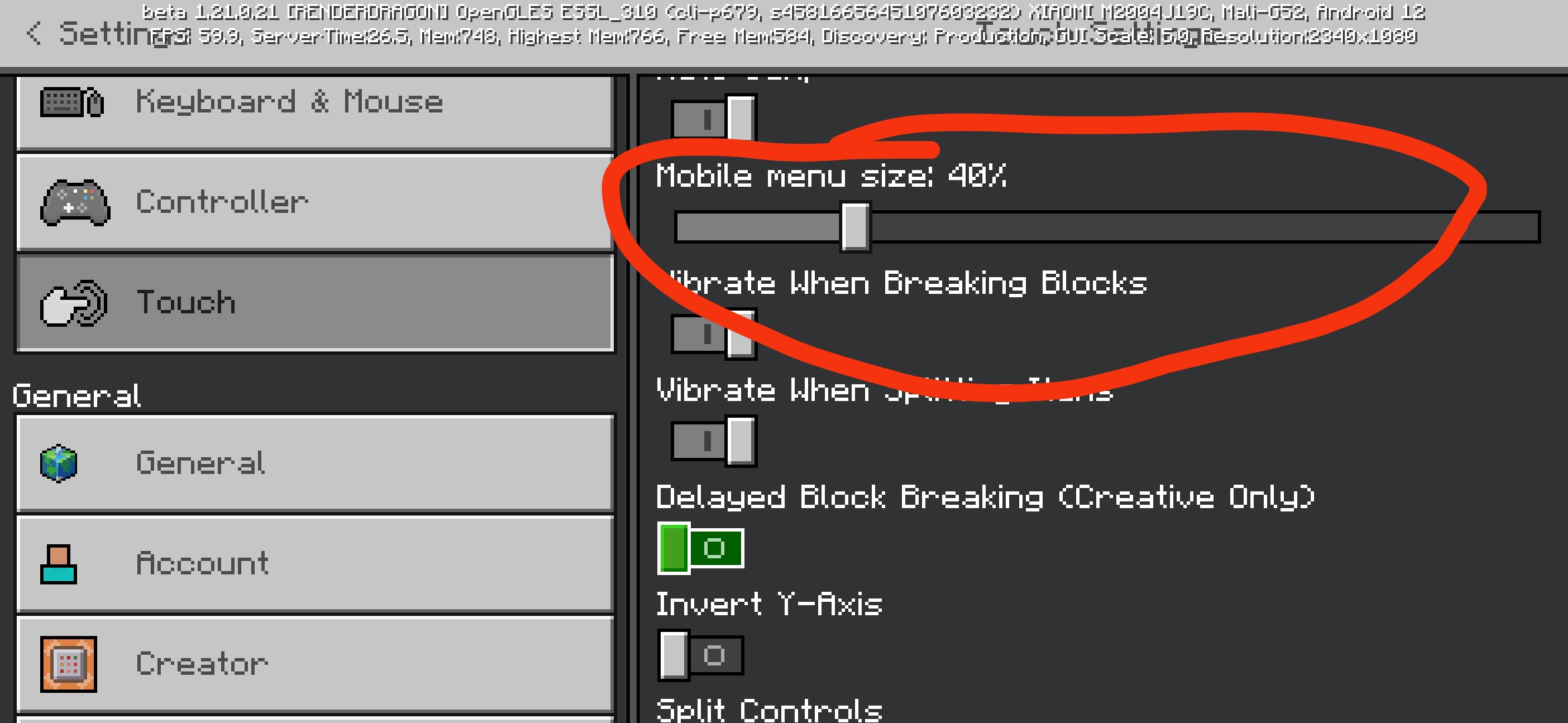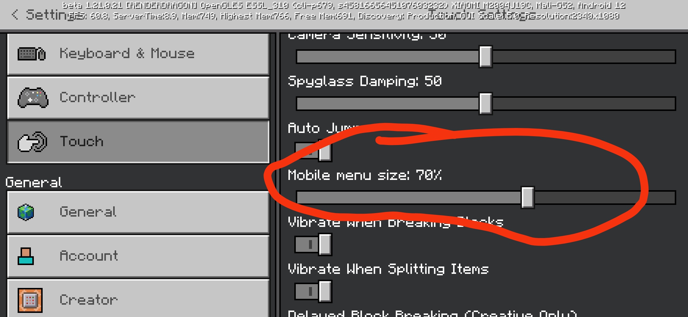 I don't know if it's a bug or not so the menu button size is an error I use 70 too big I use 40 too small but the top button is the right one I use 70 when I use 40 too small I also use 50 and it's a little too small so it's a bit difficult to play I don't enter the one 50 because it's complicated to open Minecraft and set it up. I edited the screenshot and gave it red. I logged in again to Minecraft. There was a bug, so I just gave 70 and 40. I don't know why this happened when I used version 1.21.20, it's still safe.