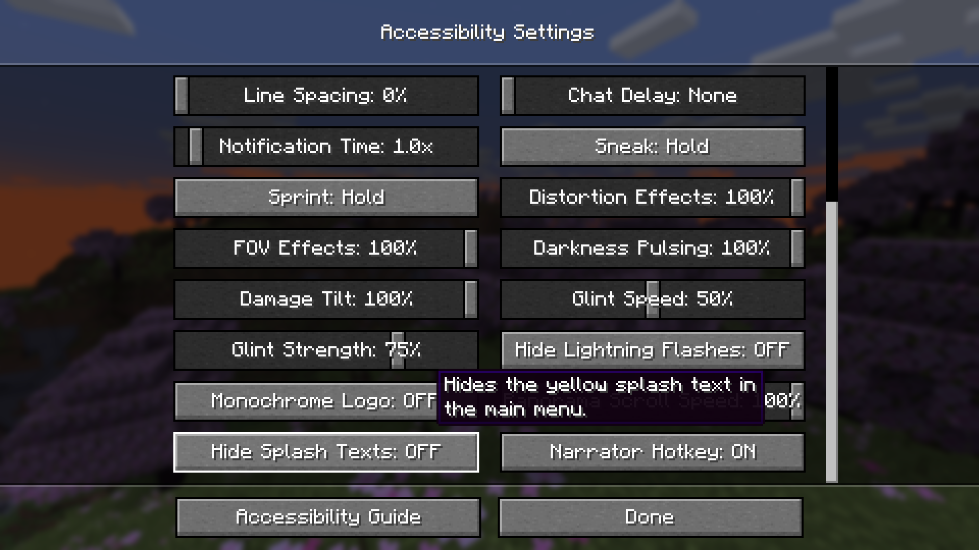 Accessibility option "Hide Splash Texts" is missing in Bedrock Edition. This option was introduced into Java in snapshot 23w42a: