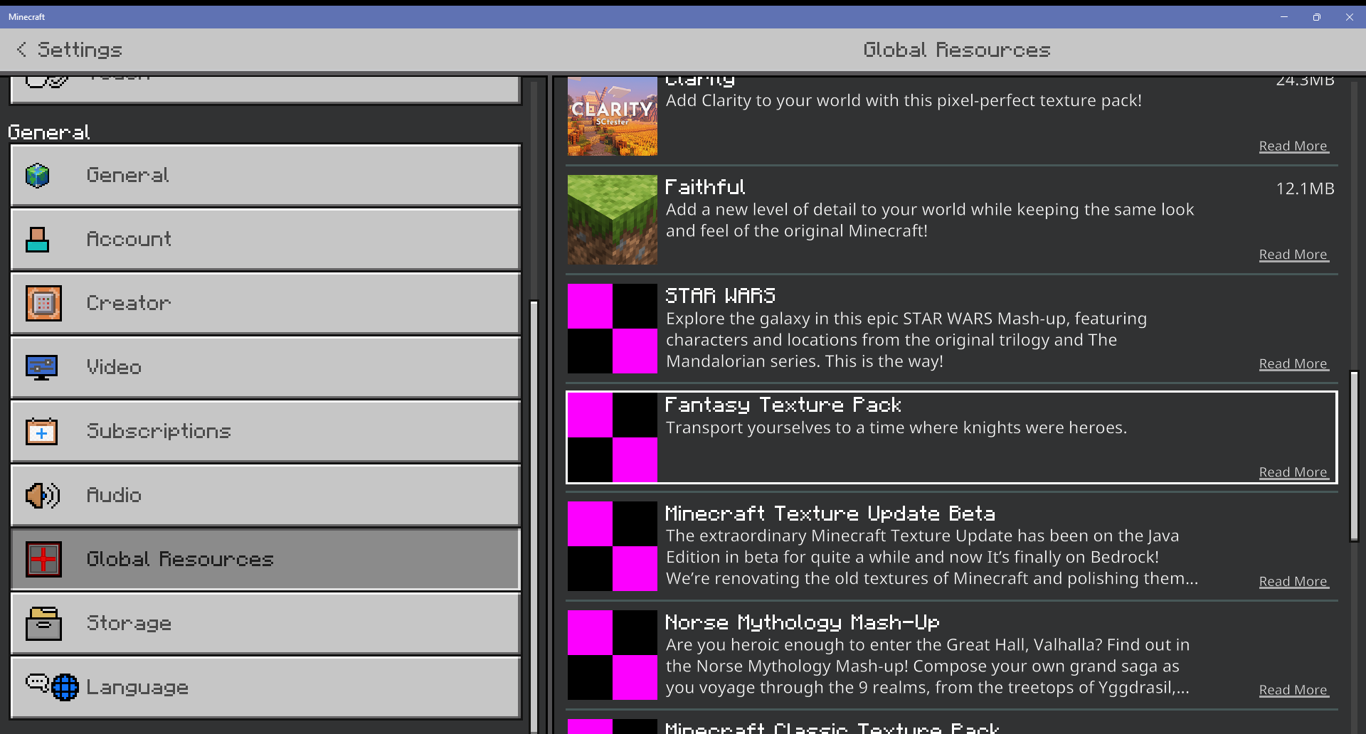 I tried going into Settings > Storage to use Clear Marketplace Cache and delete the Natural and Fantasy texture packs. I was going to delete the City Texture Pack as well, but I couldn't find it. Then I exited and noticed that the black and pink "missing texture file" icon was showing on the Global Resources button. I opened Global Resources and expanded the My Packs list and discovered that after a certain point, all the packs had the missing texture icon (see image below). So it appears that when lists of resource packs are being changed, something is breaking the links between them.
