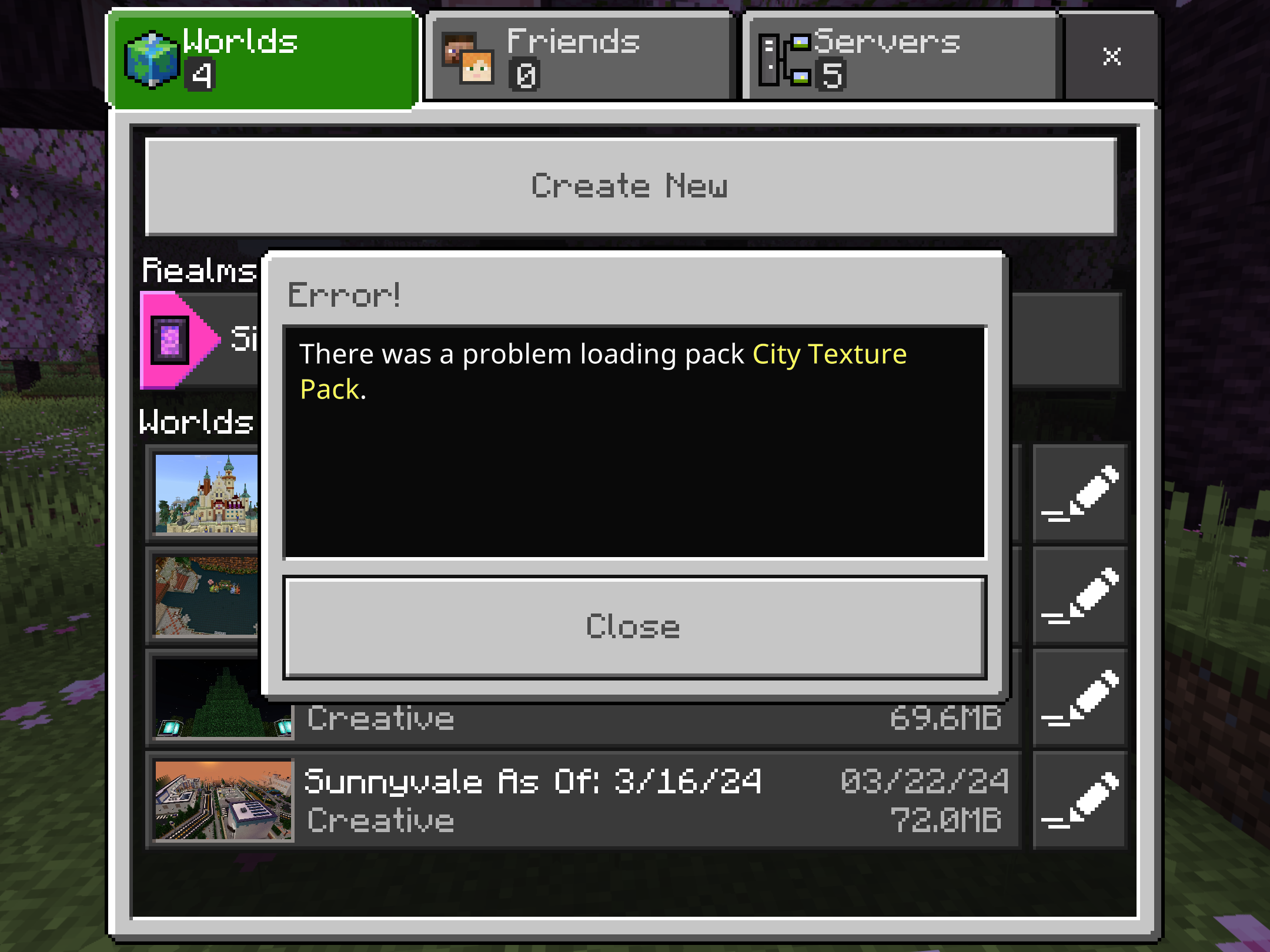 I have the same issue. Was it an update recently that caused this? It’s pretty annoying. I have such a large world created can’t worth losing in City Texture Pack.