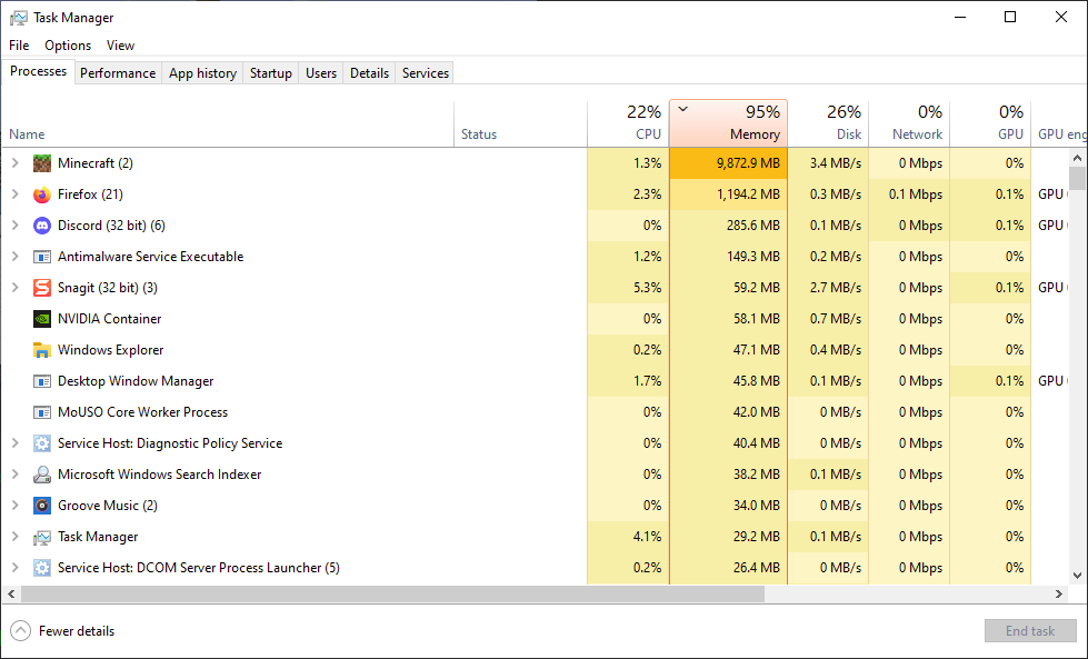 Environment: SMP server with a 4 hour restart cycle connected with windows client. At night, I start an AFK session right after server restart. After 4 hours, the server restarts again, disconnecting my session. 4-5 hours later, I come back to my PC to find minecraft on the "Server disconnected" screen but the application is unresponsive. Checking windows task manager shows that RAM usage has increased unexpectedly. Normal game play does not see this problem. Normal RAM usage is less than 1GB. See attached.