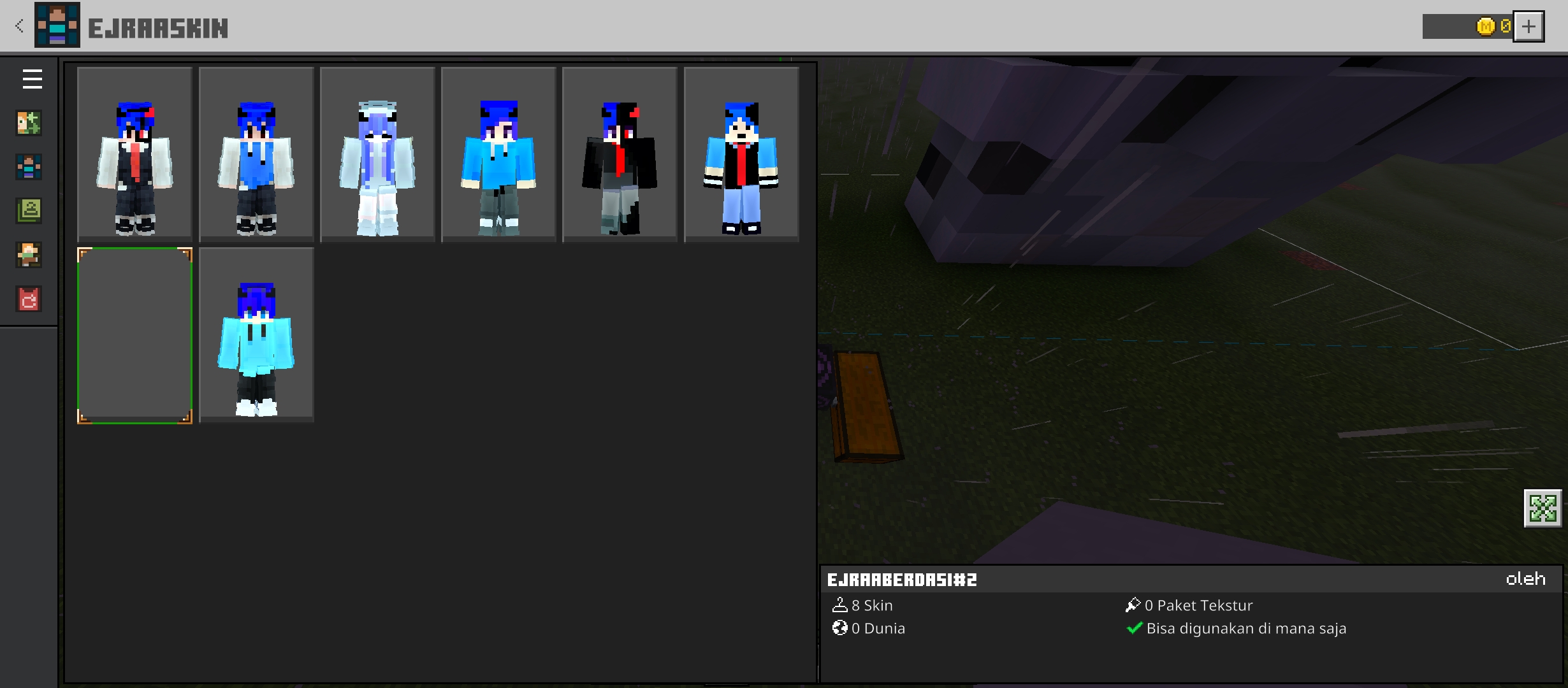 I was playing in the world, then a few moments later, my skin suddenly disappeared, I downloaded my skin pack again, my skin disappeared again (bad translation)