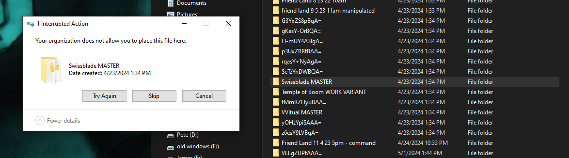 When trying to move or copy/paste my world folders, I receive the error message "Your organization does not allow you to place this file here." Although this would seem like a Windows error, googling this error message returns results of other instances of users experiencing this specifically in relation to their Minecraft folders. (example: https://www.windowsphoneinfo.com/threads/your-organization-does-not-allow-you-to-place-this-file-here.771441/#Your_organization_does_not_allow_you_to_place_this_file_here)