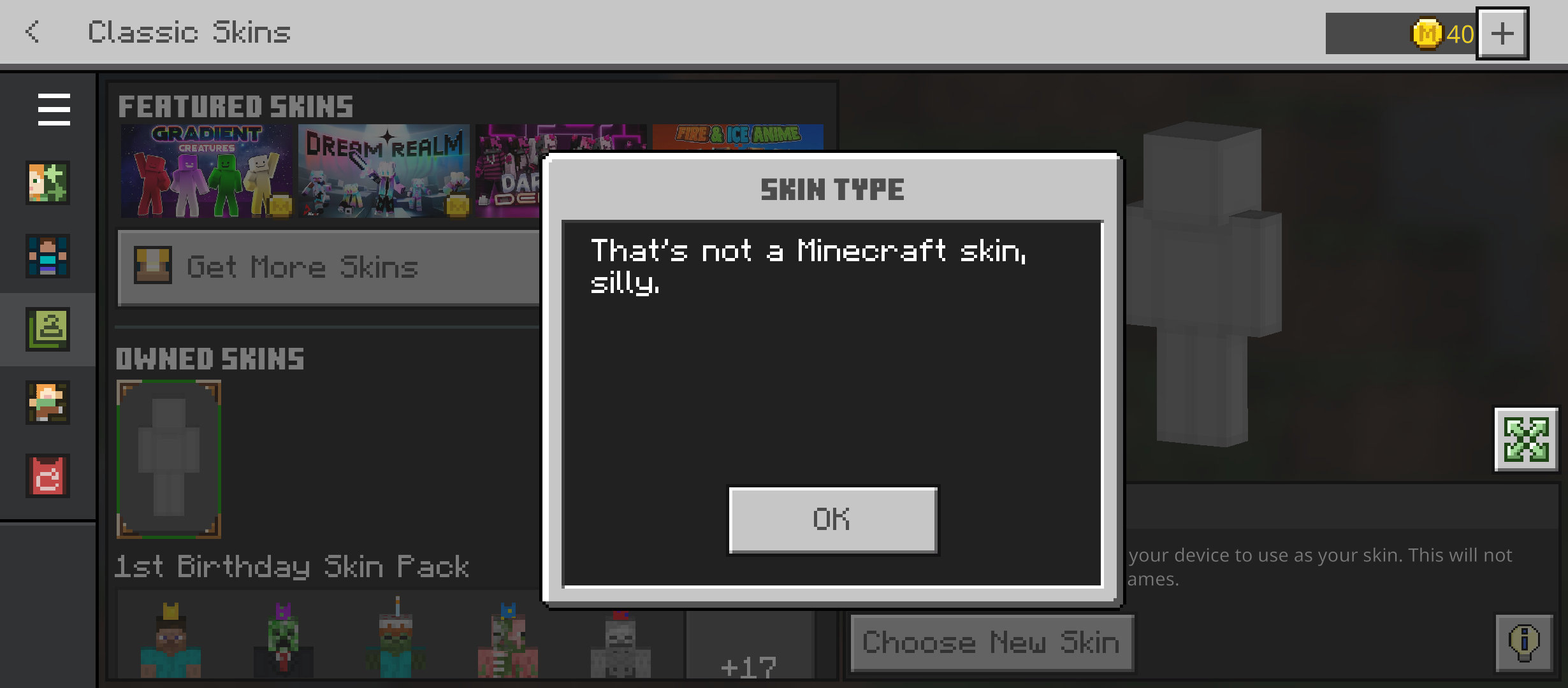 I've had this issue for months before, I bothered to make an email but I just forgot to answer back. So my issue is that I've been trying to import my skin on Minecraft for days and it always says that it's not a skin when it is, I even checked if it was 64x64 and PNG and it was but it just doesn't seem to work. It's been irritating me since I've been wanting to change my skin to something cool and not basic. please let me know when this is issued.