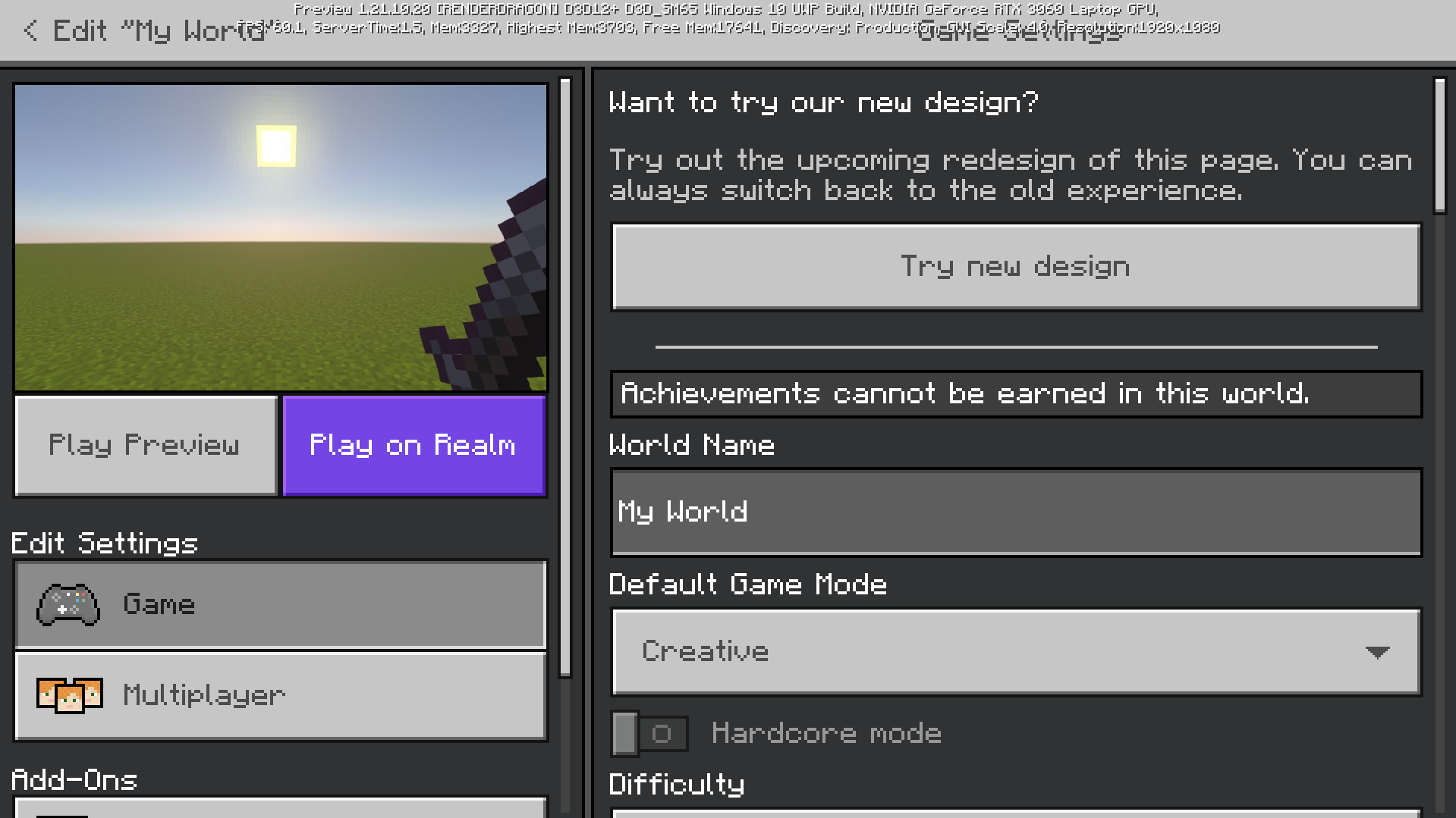 The player's hand and held items are visible in the world's thumbnail.