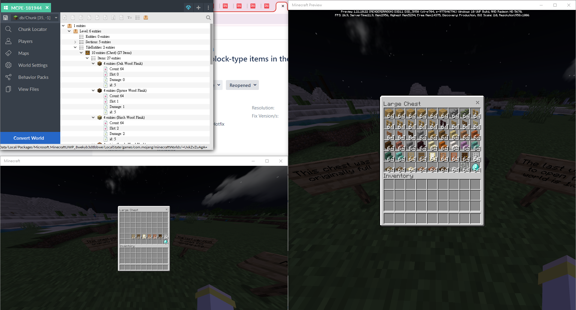 When upgrading worlds that were using numerical IDs prior to version 1.5.0, block-type items in containers like chests or item frames would disappear{}. This did not occur in version 1.19.70, so the bug might have been introduced sometime after 1.19.70 and before 1.20.80.