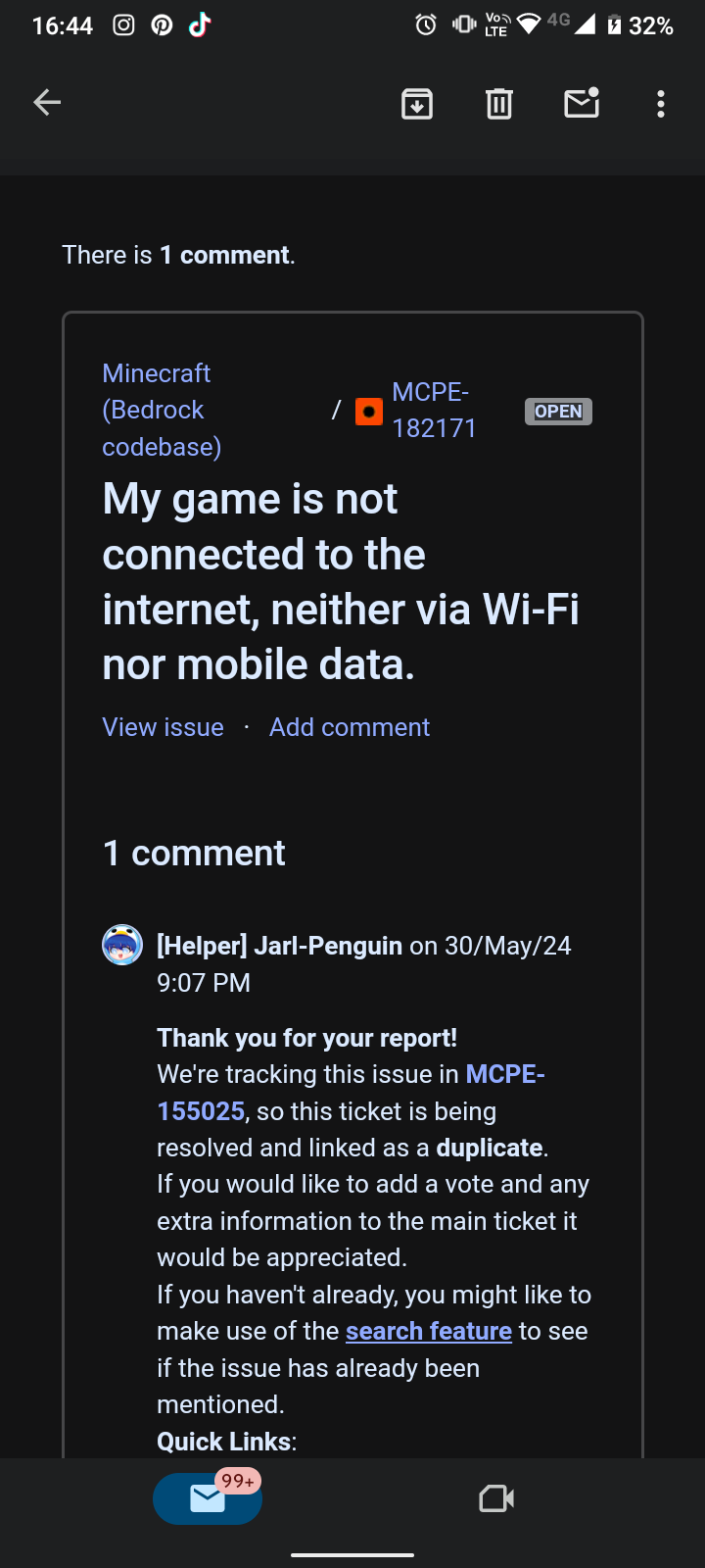 In this instance, your report was resolved as a duplicate of another report. This means that you've reported an issue that has already been reported before and/or is currently being tracked by Mojang.