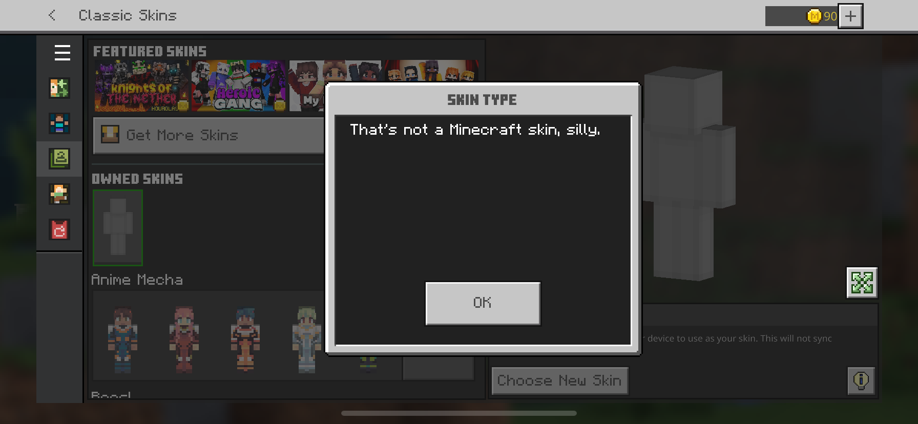 I've been trying to upload a skin and it keeps giving me the same message error "that's not a Minecraft skin, silly" I've tried using other skins but it still would work so I'm not sure what to do.