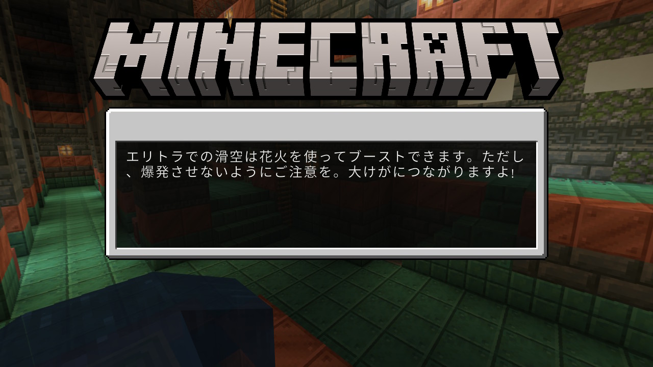 エリトラでの滑空は花火を使ってブーストできます。ただし、爆発させないようにご注意を。大けがにつながりますよ! | エリトラでの滑空は花火を使ってブーストできます。ただし、花火の星を入れないようにご注意を。大けがにつながりますよ! | A little hard to read |