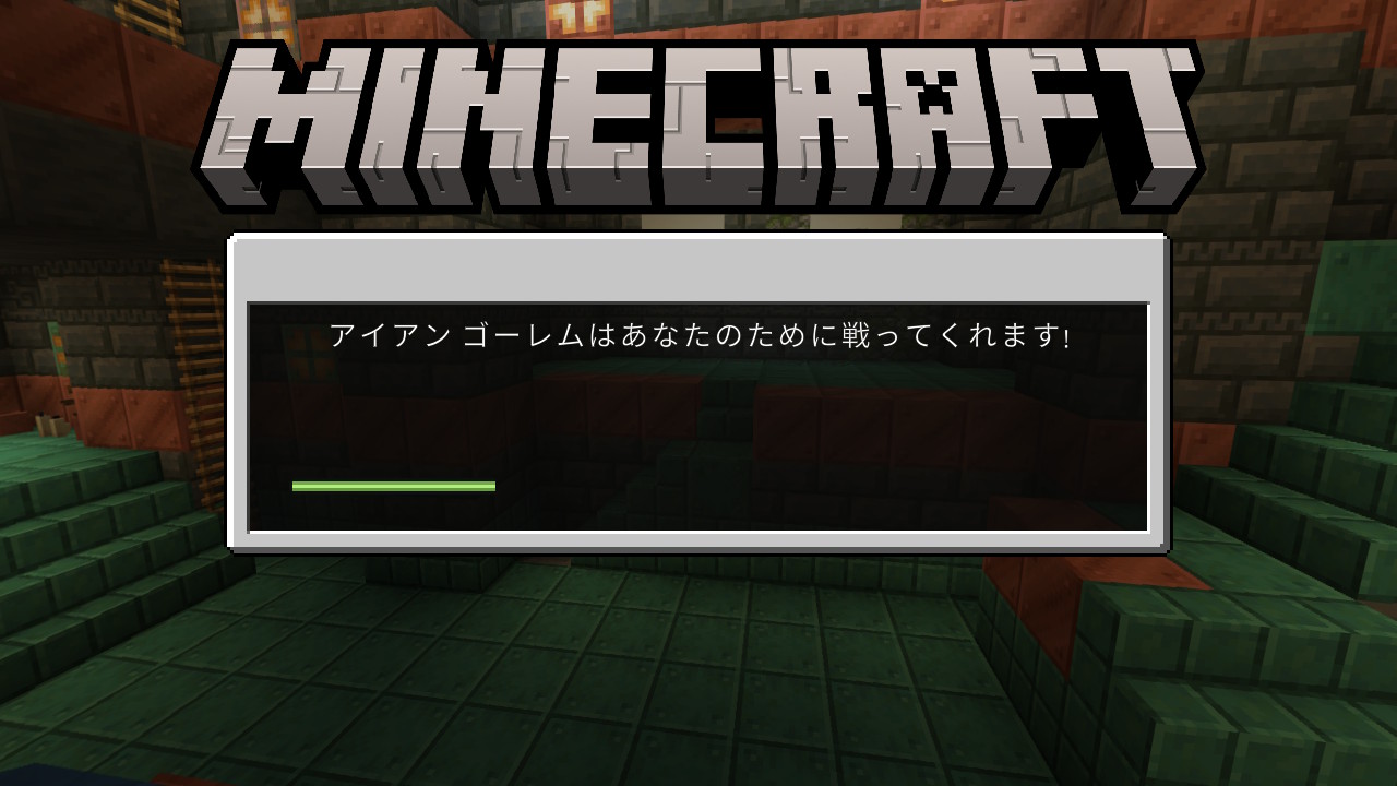 アイアン ゴーレムはあなたのために戦ってくれます! | アイアンゴーレムは村をモンスターから守ってくれています。 | The description is incorrect (because the Iron Golem does not follow the player) |