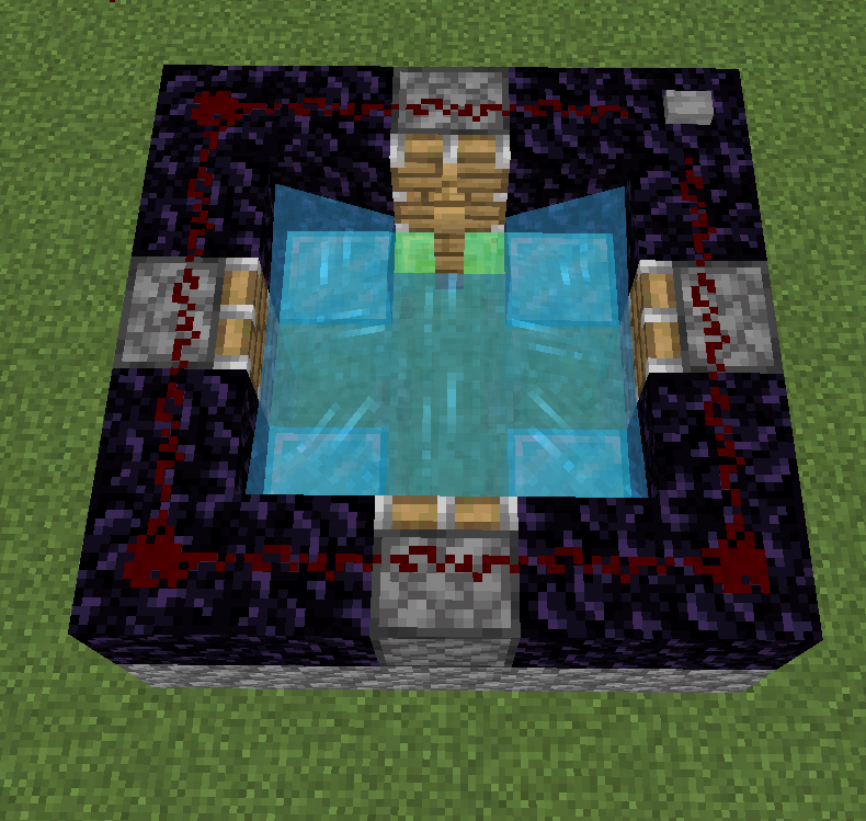 Build this structure. Cobblestone will be found under all the pistons and obsidian in this build. At the center of the build is a source water block: