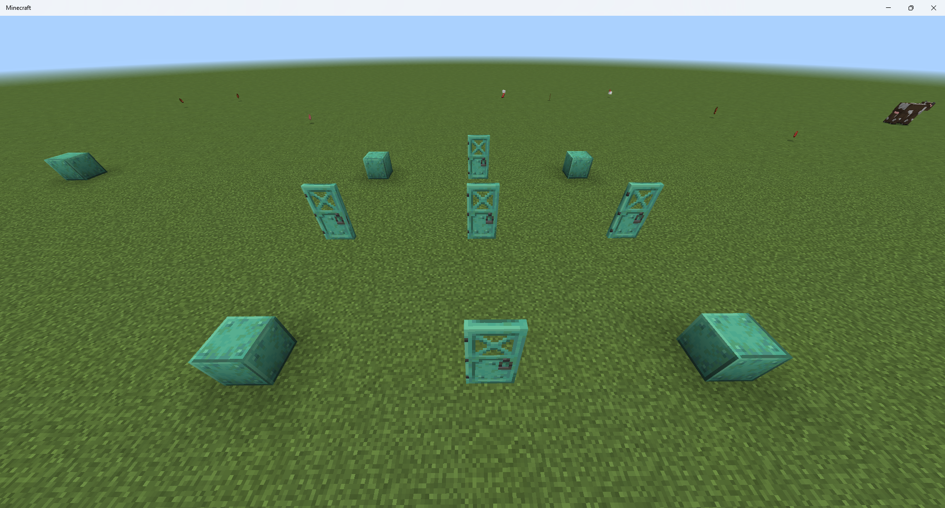 I have noticed that of all of the copper blocks, copper doors take by far the longest time to oxidize. I suspect that the game thinks that since copper doors occupy 2 blocks, the game treats it as if there are two copper blocks next to each other, therefore causing the oxidization process to occur at that rate rather than the rate you get when the copper is spaced out. this is what causes the oxidization rate to be much slower than the other copper blocks. I was aging a bunch of copper grates and doors for some builds I'm doing in a survival world, and I was getting fully oxidized grates before the doors had even reached the 'exposed' stage. I doubt this is an intended feature, so I decided to report it here.