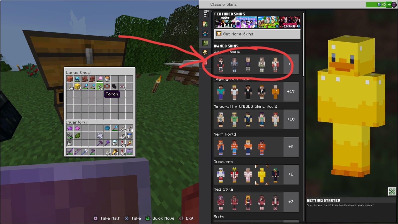 When playing splitscreen on PlayStation, player 2 cannot access their owned bought skin packs from the Minecraft Marketplace. However, they can access player 1s skin packs even though they have not purchased any.