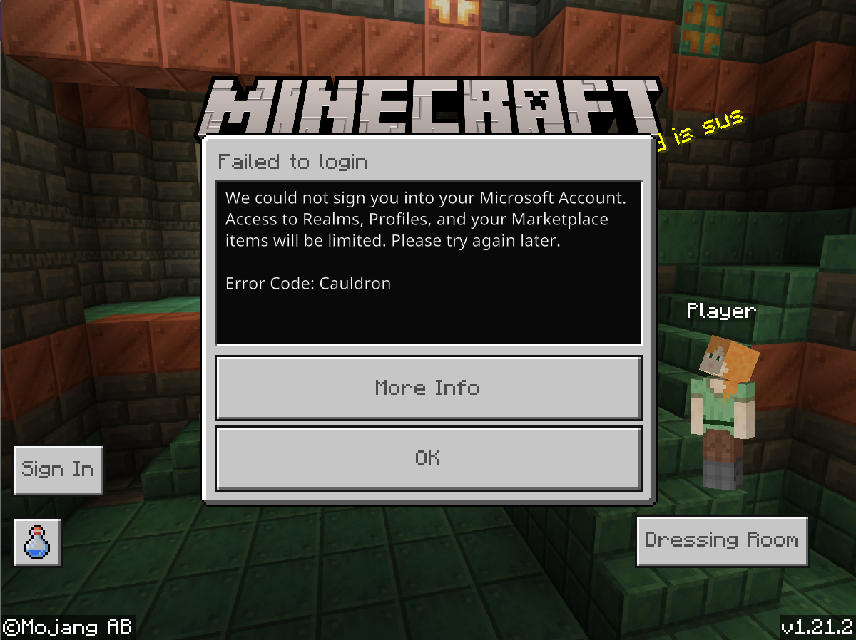 The game loads and is playable as a guest/non signed in or not connected to my Microsoft account. Since it is not online, you do not have access to your cloud realms/items/friends/skins or anything else. The game gets stuck at the "Signing in with your Microsoft Account" phase. Then, it errors out with Cauldron. I also saw a c-0010 also. I have gone through every troubleshooting step except going out to buy a 5G WiFi adapter as some online have recommended. I am using 2.4G WiFi connection and can play other games as well as access my Microsoft account and features without issue besides Minecraft. I re downloaded the game and the launcher to launch the game (so slow, BTW).