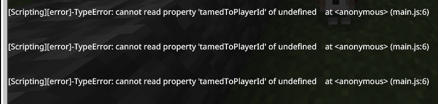 When I interact with this tamed wolf, I receive an error saying that the property “tamedToPlayer” is undefined. I have it set up to send a chat message when I have interacted, and the result of tamedToPlayer, tamedToPlayerId, and isTamed The script file is below, in addition to the behavior pack.