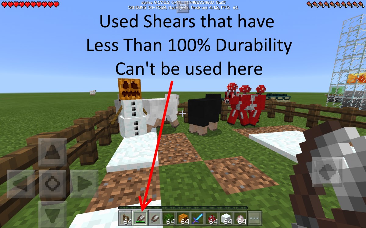 Well, I'm here to report a bug that we have in version 0.17.0 / 1.0 of minecraft pocket edition, it turns out that there is no longer the option to take the wool off the sheep and I would be grateful if they could fix this error.