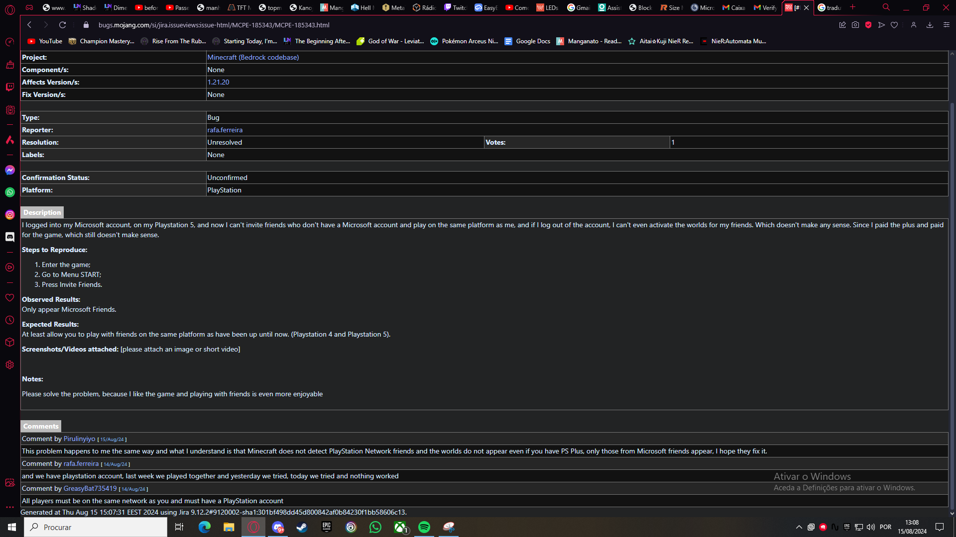 I logged into my Microsoft account, on my Playstation 5, and now I can't invite friends who don't have a Microsoft account and play on the same platform as me, and if I log out of the account, I can't even activate the worlds for my friends. Which doesn't make any sense. Since I paid the plus and paid for the game, which still doesn't make sense. I already exposed this problem, just this week and in addition to making me look like an ass, other people were right in the comments. They don't want to fix it, that's fine, I've also uninstalled the game and I want a refund for the game, which I will deal with Sony directly.