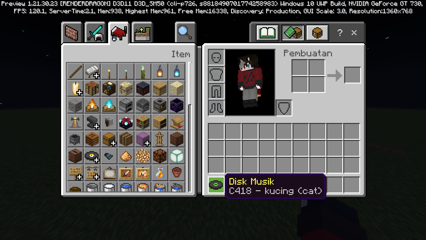 While using Indonesian language, the name of the music disc are translated, with the original name placed inside bracket after the translated text (C418 - kucing (cat), for example), this only happens in Indonesian language, while on the other language only the translated name is shown.