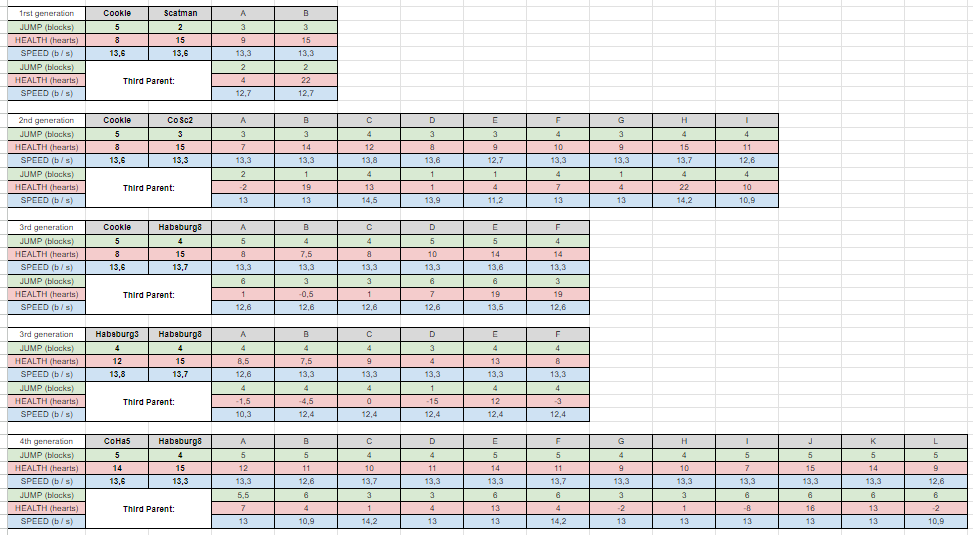 I've been collecting the data from all my horses, and contrasted it with the current understanding that I have of horse breeding (stats = avg[parent1; parent2; random parent] ).