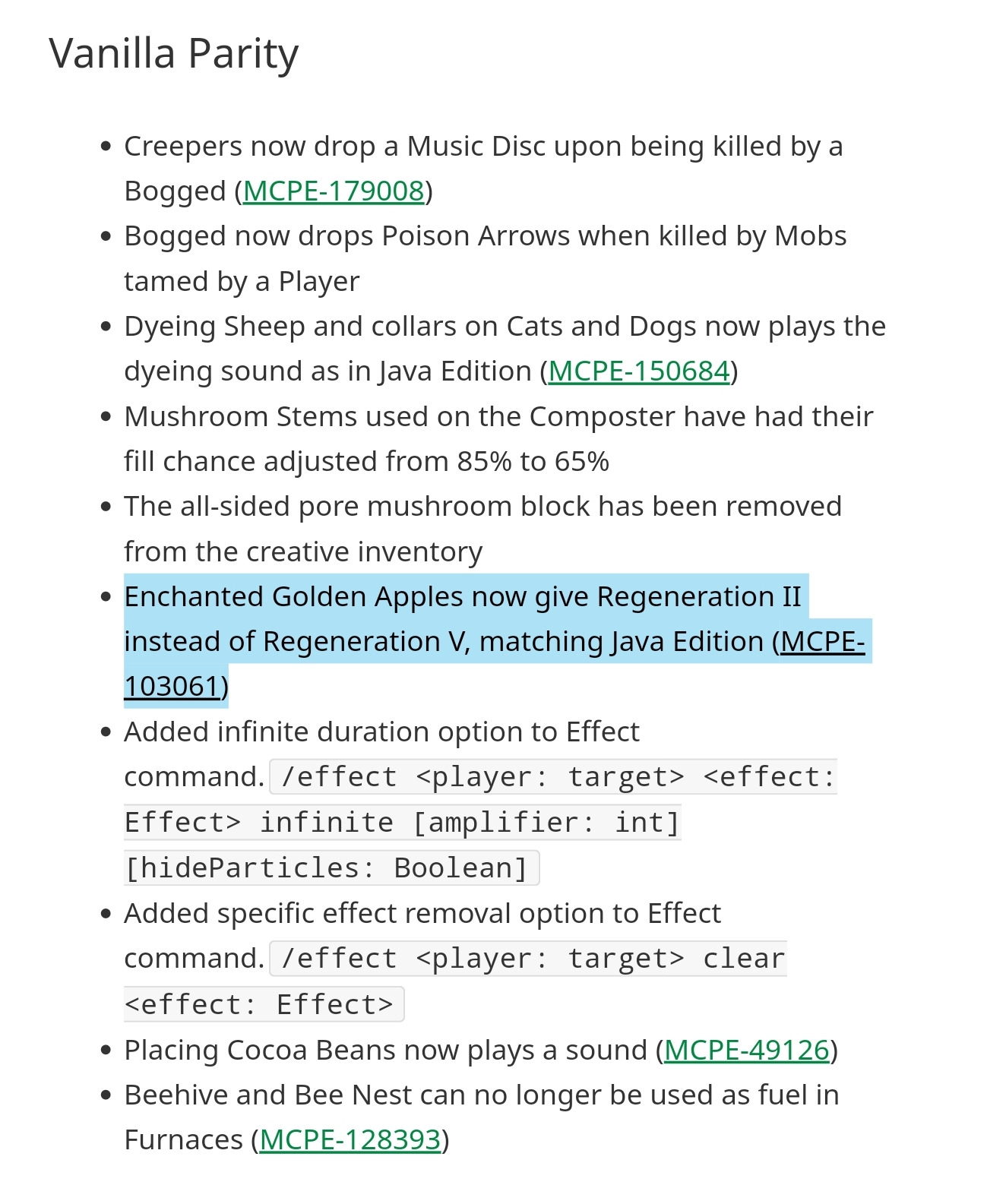 Enchanted Golden Apples now give Regeneration II instead of Regeneration V, matching Java Edition (MCPE-103061)