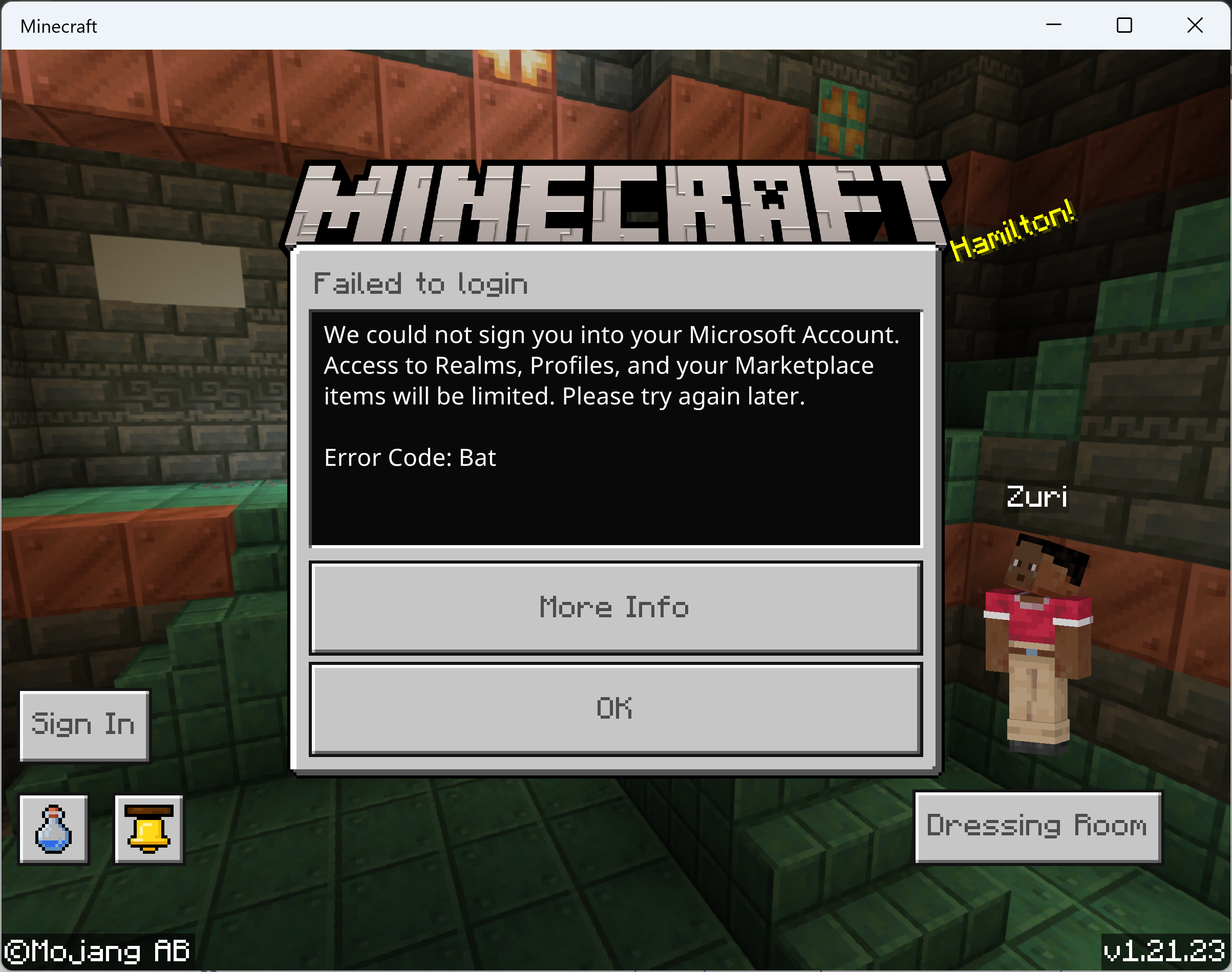 I'm running the ARM version of Windows in a virtual machine (using VMWare Fusion). I keep getting error code: BAT when attempting to login to my Microsoft account for Minecraft. I've had no issues logging into the Microsoft account on Windows, the XBOX app, or other apps on the virtual machine. I've already attempted the suggested steps in issue MCPE-126897Β with no success. What can I do to resolve this?