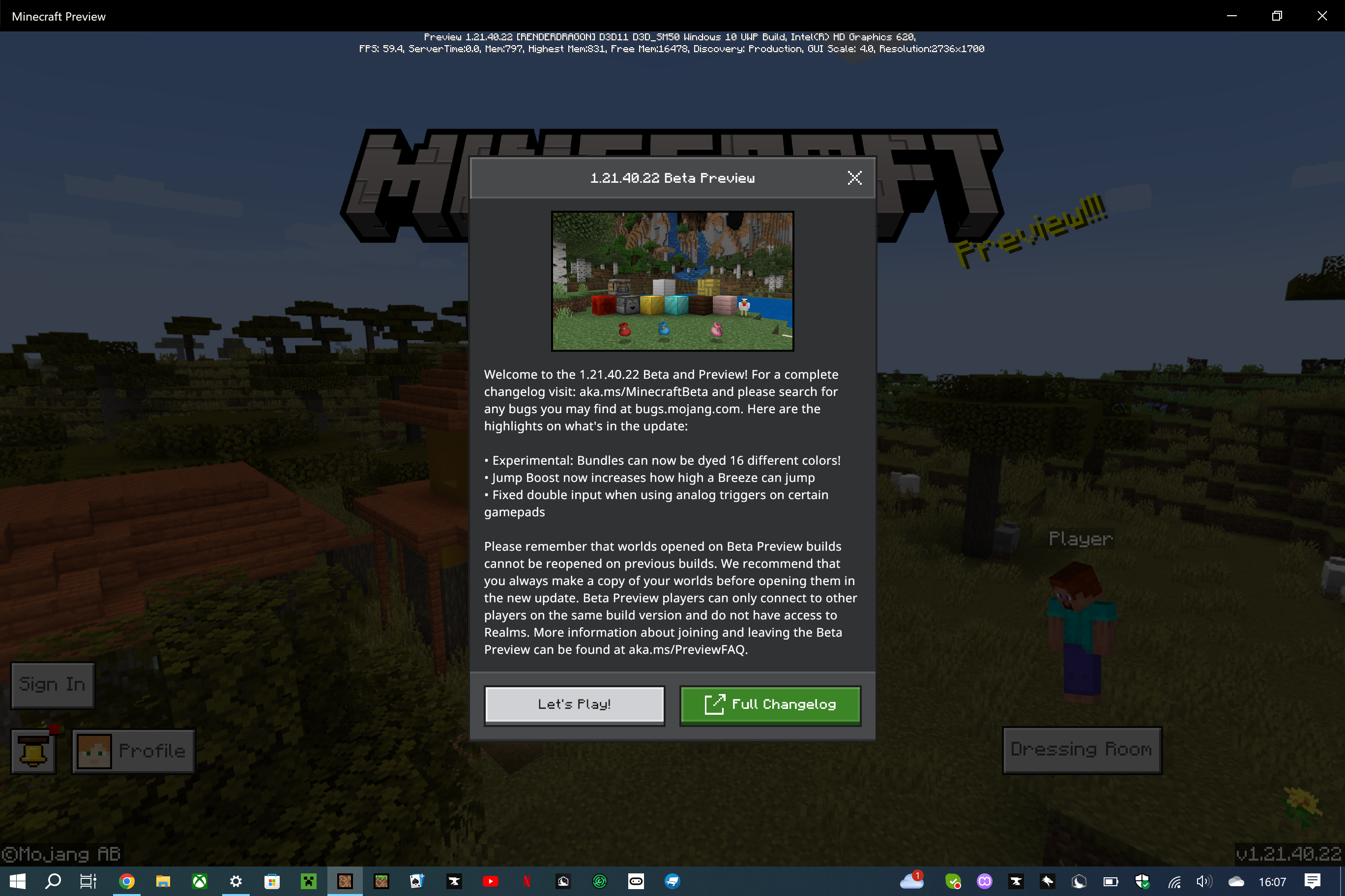 when I launched minecraft preview version 1.21.40.22, a notification about the preview's update appeared, but I could not get rid of it. I tried reopening the game but it was still on there.