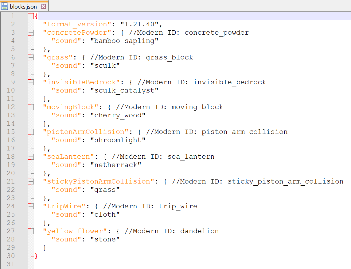 All outdated block IDs throw errors when used in blocks.json with a format_version of 1.21.30 or later.