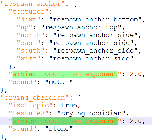 However, this new field does not work properly with light sources. This means the "ambient_occlusion_exponent" values configured for crying obsidian and the respawn anchor in vanilla are not displayed in-game.