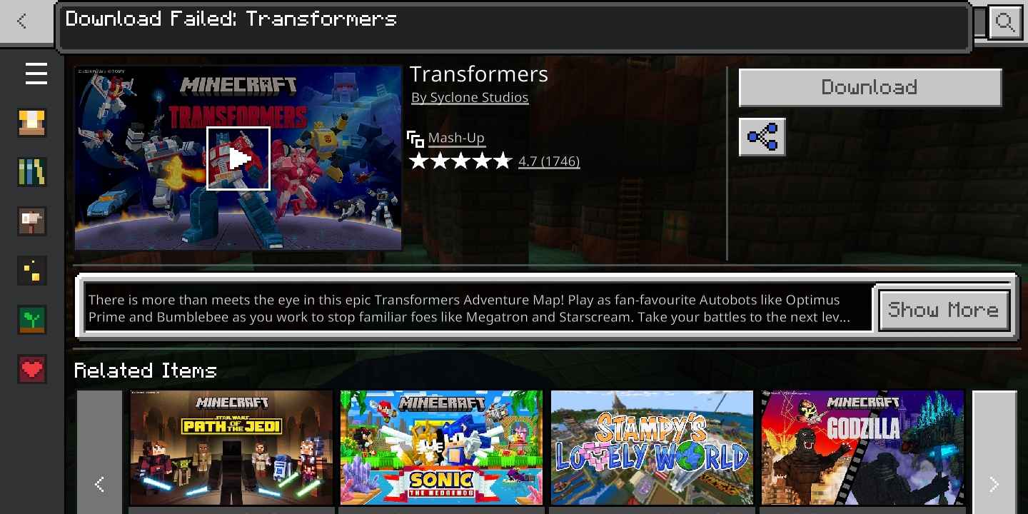 Recently, I bought 'Transformers' texture pack from marketplace by 1510 minecoins. But when I try to download it, it says that error download. I tried to contact with support and they said that to clean cache. But it didn't work. It only happens for this pack. Other pack are okay to download. And also, I tried with other devices but still give the same problem.
