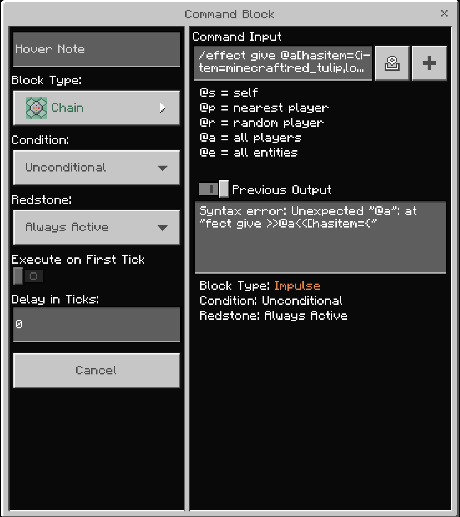 When using command blocks in Minecraft Bedrock Edition, the type of command block (Chain, Repeat, or Impulse) does not update correctly in the command block interface. In the attached screenshot, the command block is visually a Chain Command Block, but the UI lists it as a Repeat Command Block. This bug causes confusion when setting up command block sequences, as the block’s type is not properly reflected in the interface.