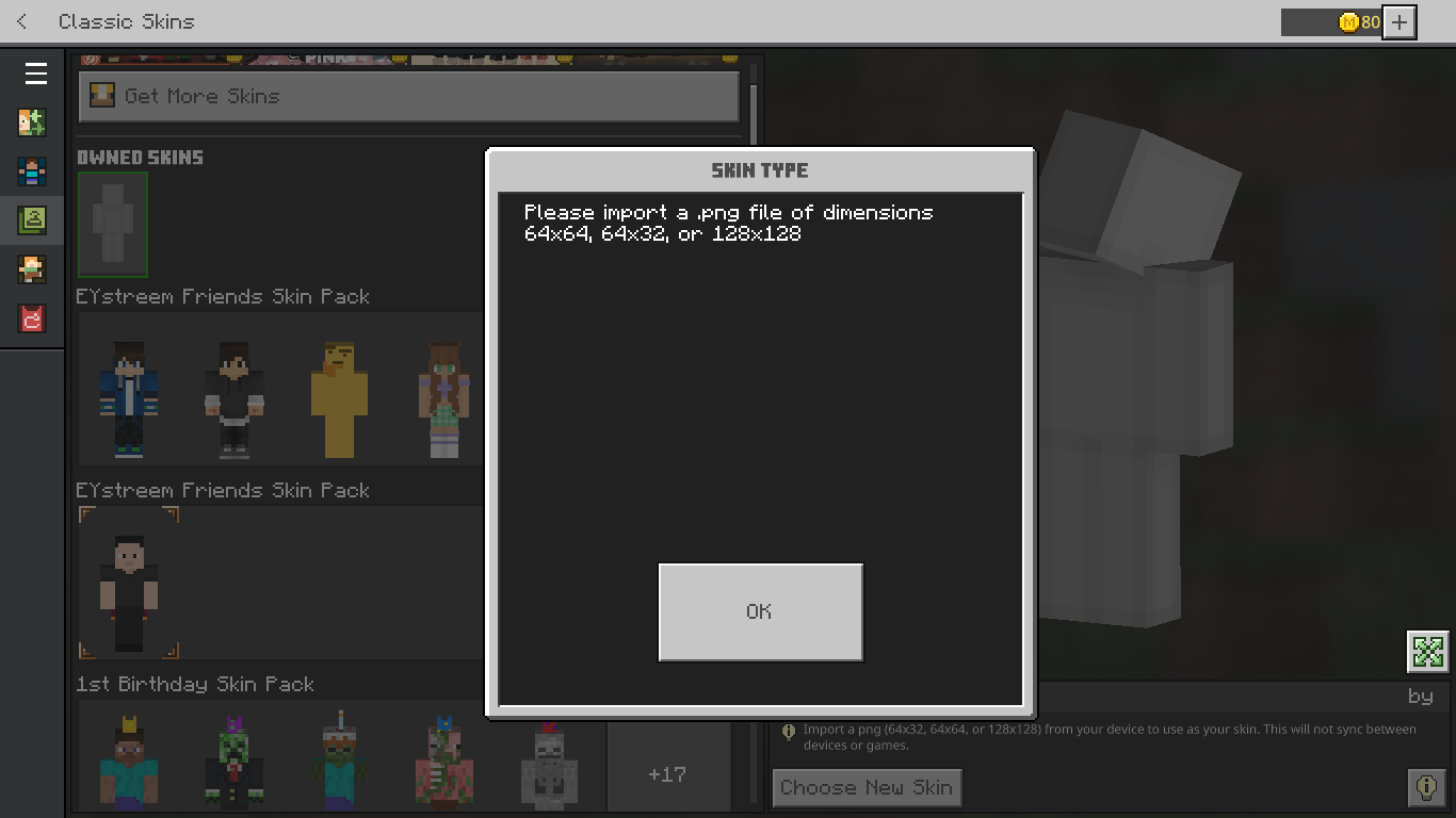 When I tried to choose a skin, I receive an error message "Please import a .png file of dimensions 64x64, 64x32, or 128x128".