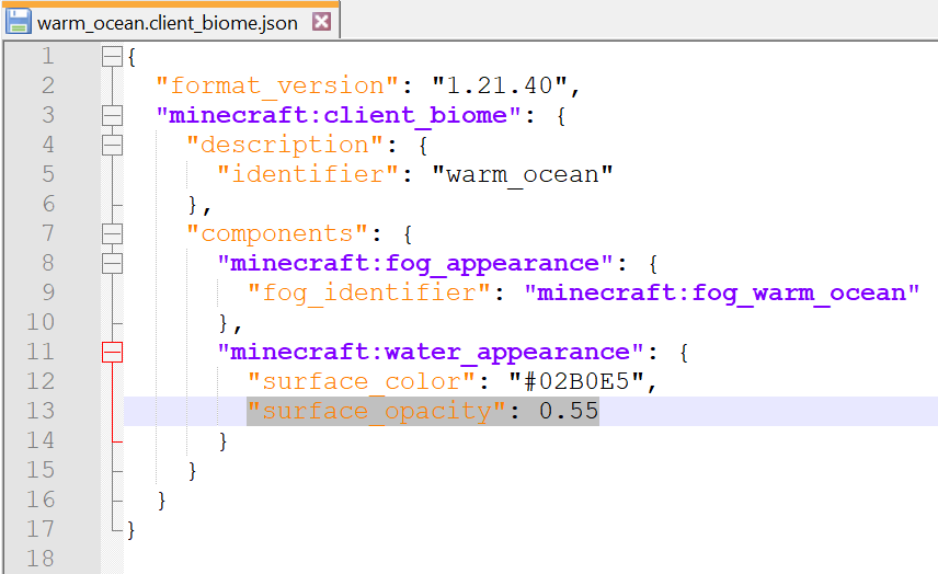 As of version 1.21.40, the old biomes_client.json is no longer loaded from the vanilla resources, in favor of the newer "client biome" files; however, the "water_surface_transparency" field that warm oceans used was not ported over, causing warm ocean water to render at the default transparency.