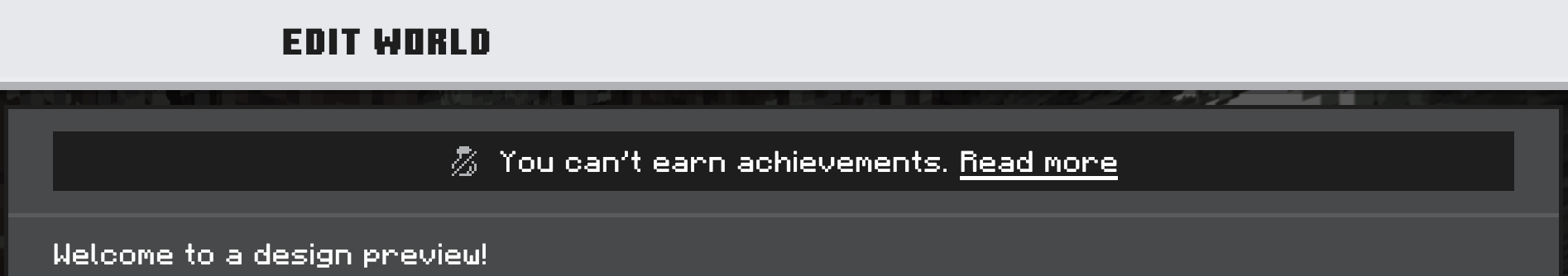 The "You cant earn achievements" notification still shows a water bottle for it's icon after the change to the overall achievement icon to a book. This appears on the Create New World and Edit World screens.