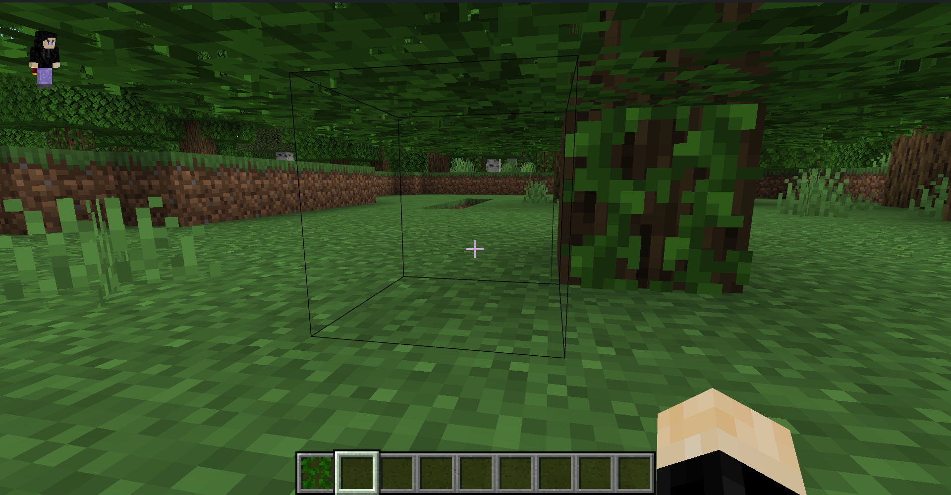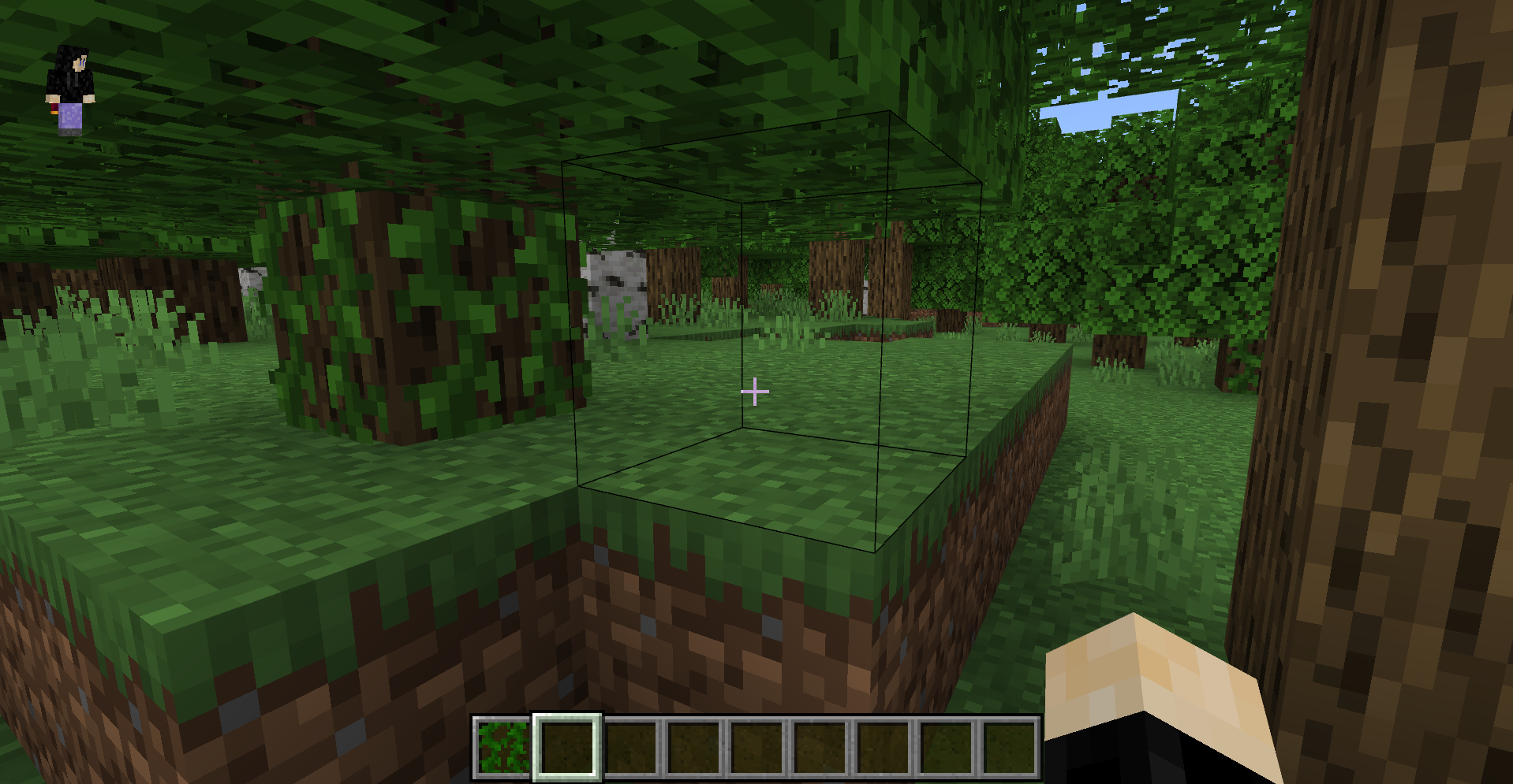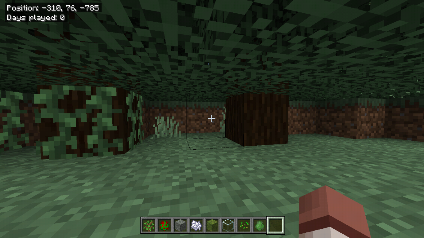 When vines spread in a one block area underneath leaf blocks, there is a chance of an invisible block being created next to it. This block has the hitbox of a normal sized block, but doesn't show anything. If any blocks nearby are broken, the invisible block will disappear. Pick blocking on it does reveal that it is a vine. This most likely relates to MCPE-29111, however you cannot place the invisible vine directly. When the block on top is not a leaf block, the vine will spread under the bottom of that block, but only when the area is one block high.
