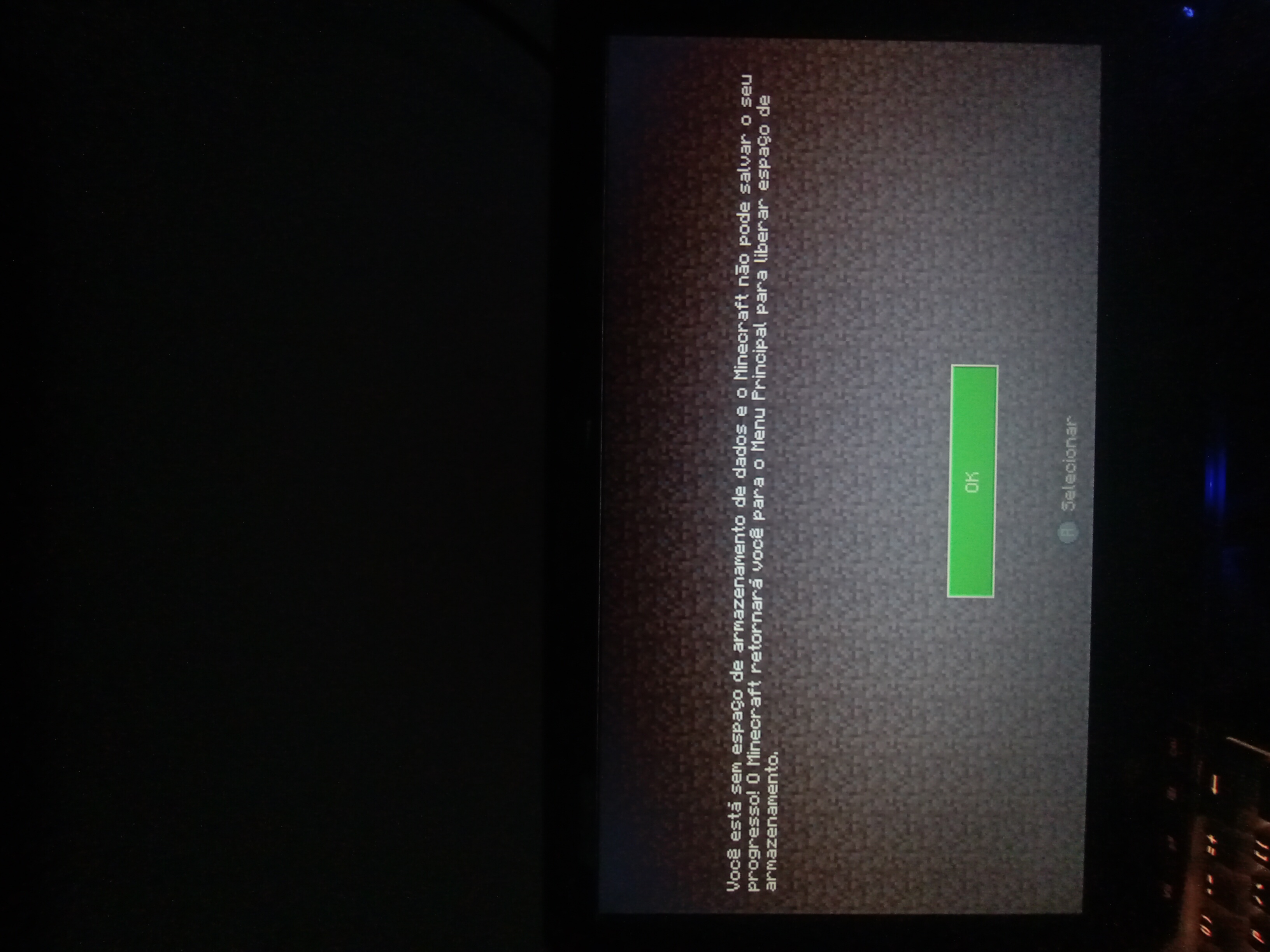 Eu estou tentando entrar no meu mundo do Minecraft no Xbox one S, mas está aparecendo o seguinte erro: VOCÊ ESTÁ SEM ESPAÇO DE ARMAZENAMENTO DE DADOS E O MINECRAFT NÃO PODE SALVAR O SEU PROGRESSO! O MINECRAFT RETORNARÁ VOCÊ PARA O MENU PRINCIPAL PARA LIBERAR ESPAÇO DE ARMAZENAMENTO.