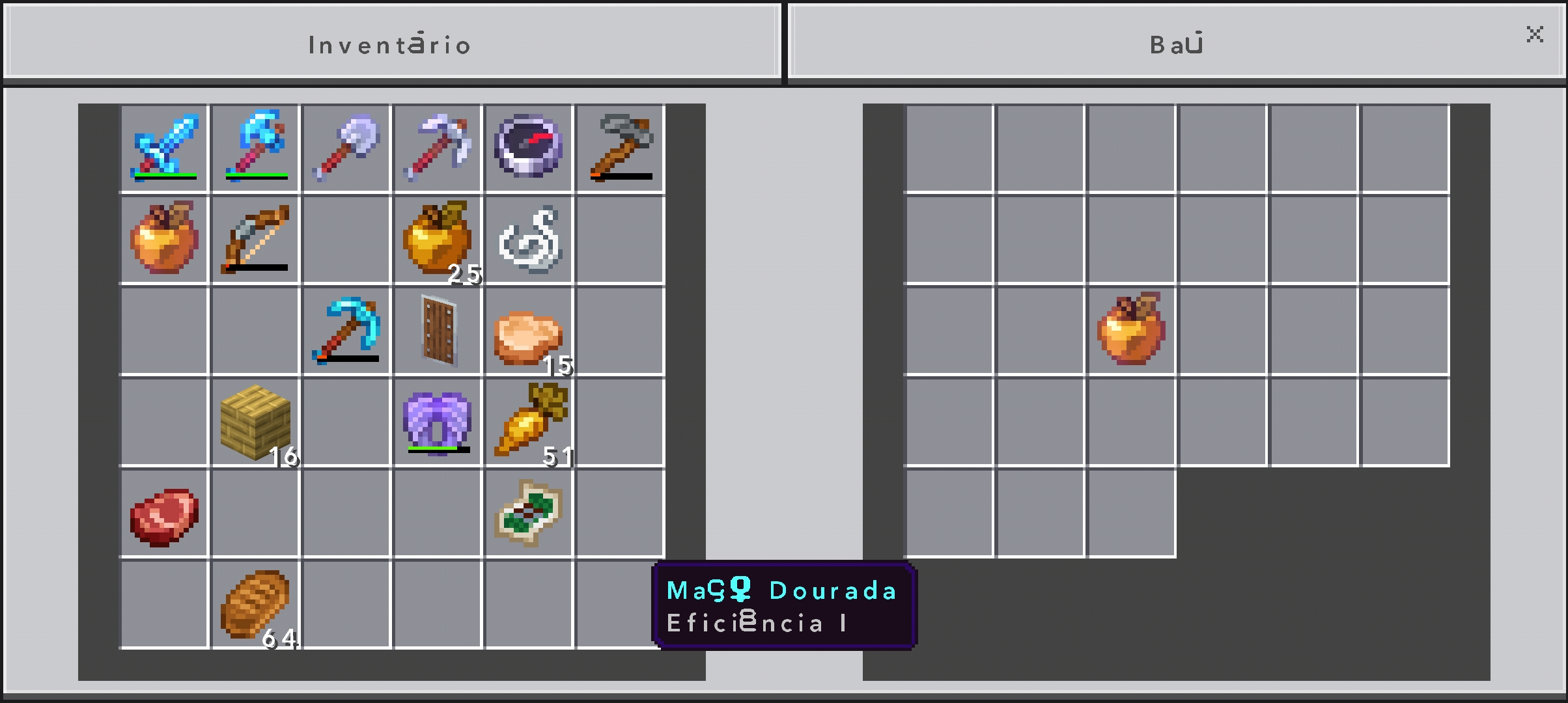 This bug allows the player to find a golden apple with the efficiency 1 enchantment in some chests in the forest mansion