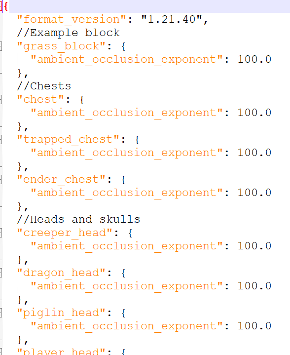The attached sample pack sets the ambient_occlusion_exponent of all the blocks in the list above to 100. It also sets this value for "grass_block" to prove the pack is working.