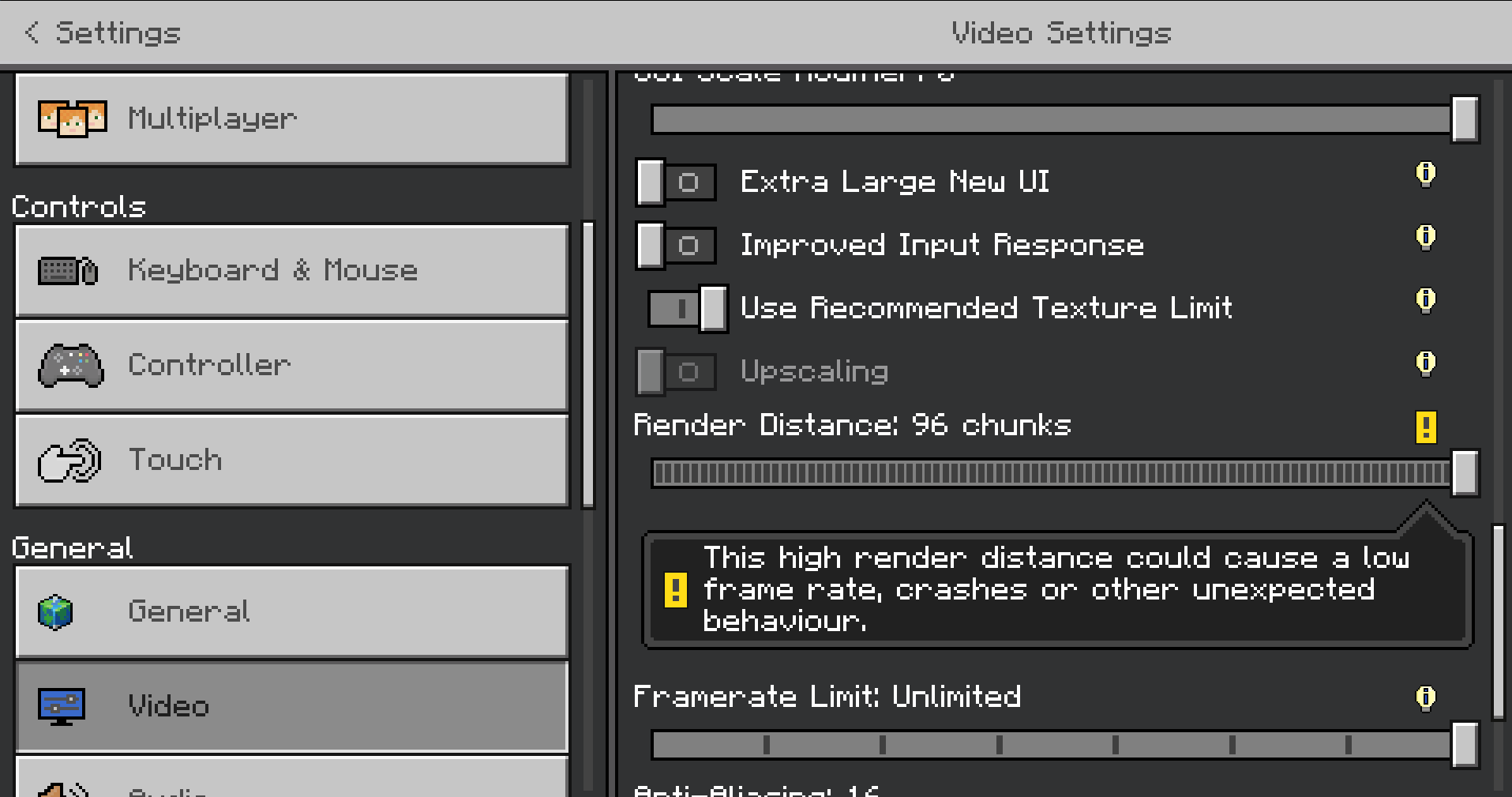 Occasionally after closing and opening Minecraft Windows with a lower render distance set, you may find your render distance reset back to the max (96)