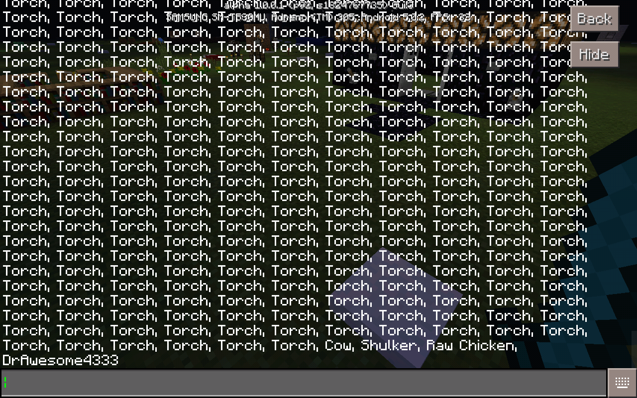 The screenshots below show the torches and what happened after I typed /kill @e to get rid of the lag.