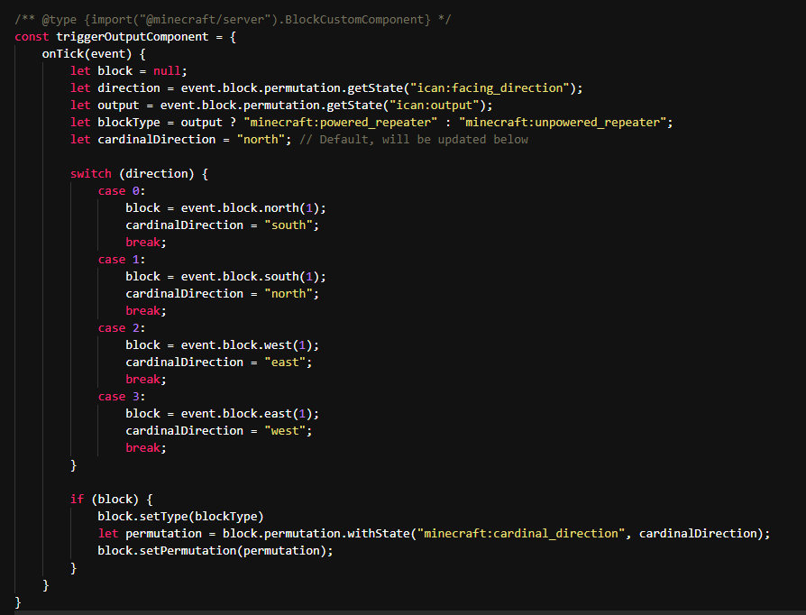 Here is code from the Bedrock Scripting API that sets a block to a powered repeater every tick and sets the cardinal direction the repeater should be facing. That being said, the model changes direction properly, but the redstone signal goes exclusively from South to North. See my other screenshot.