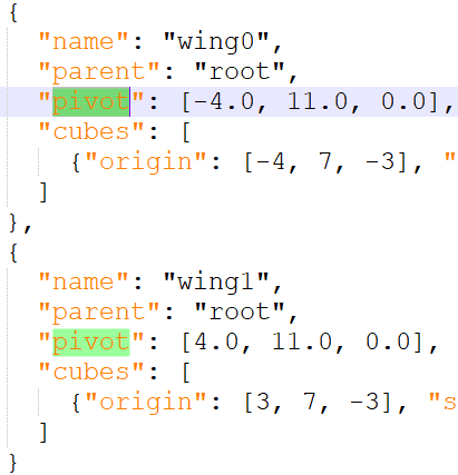 Change the "pivot" x values from ±3 to ±4 on each wing bone.