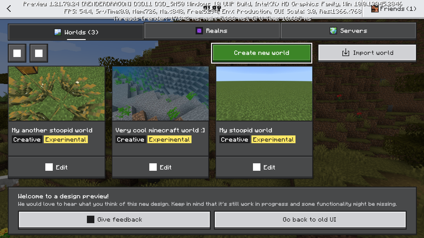another issue: preview 1.21.70.25 reverted the old template screen. At least I can now create a world. The create from button is still missing and the create new world button still lead to the template screen somehow???