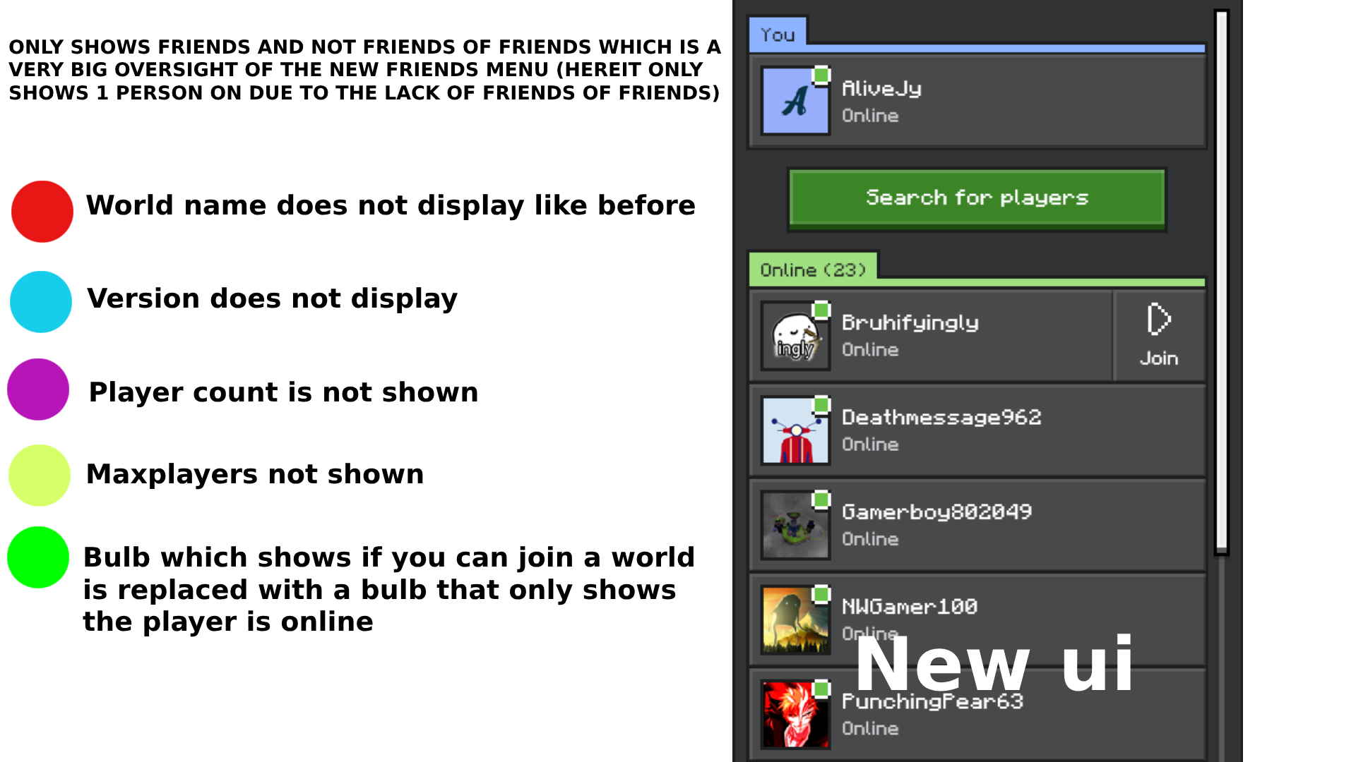 The joinability indicator now only shows if the player is online, not if the world is joinable